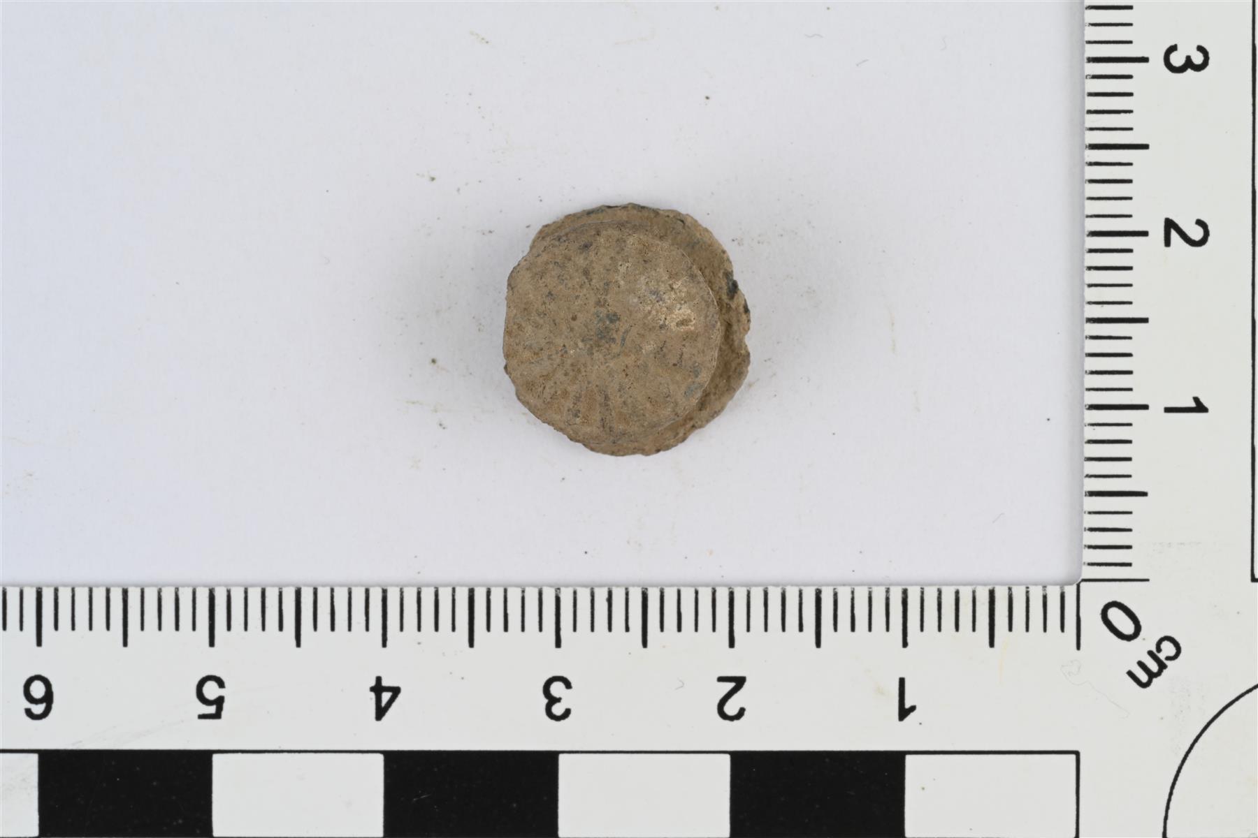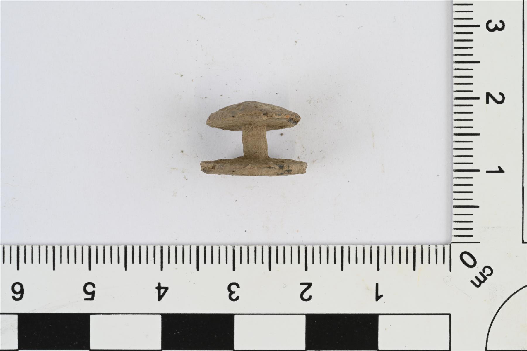 | Kaksoisnappi. Tina- tai lyijyseosta. Kaksi päällekkäistä levyä, joista päällimmäinen on varsinainen nappi ja alempi taustalevy, ja jotka liittää toisiinsa lyhyt varsi. Päällimmäinen nappiosa sivusta katsoen matalan kartion muotoinen, etupuolella säteittäistä viivakoristelua. Nappiosan halkaisija 12,5 mm ja taustalevyn 14,5 mm. | |