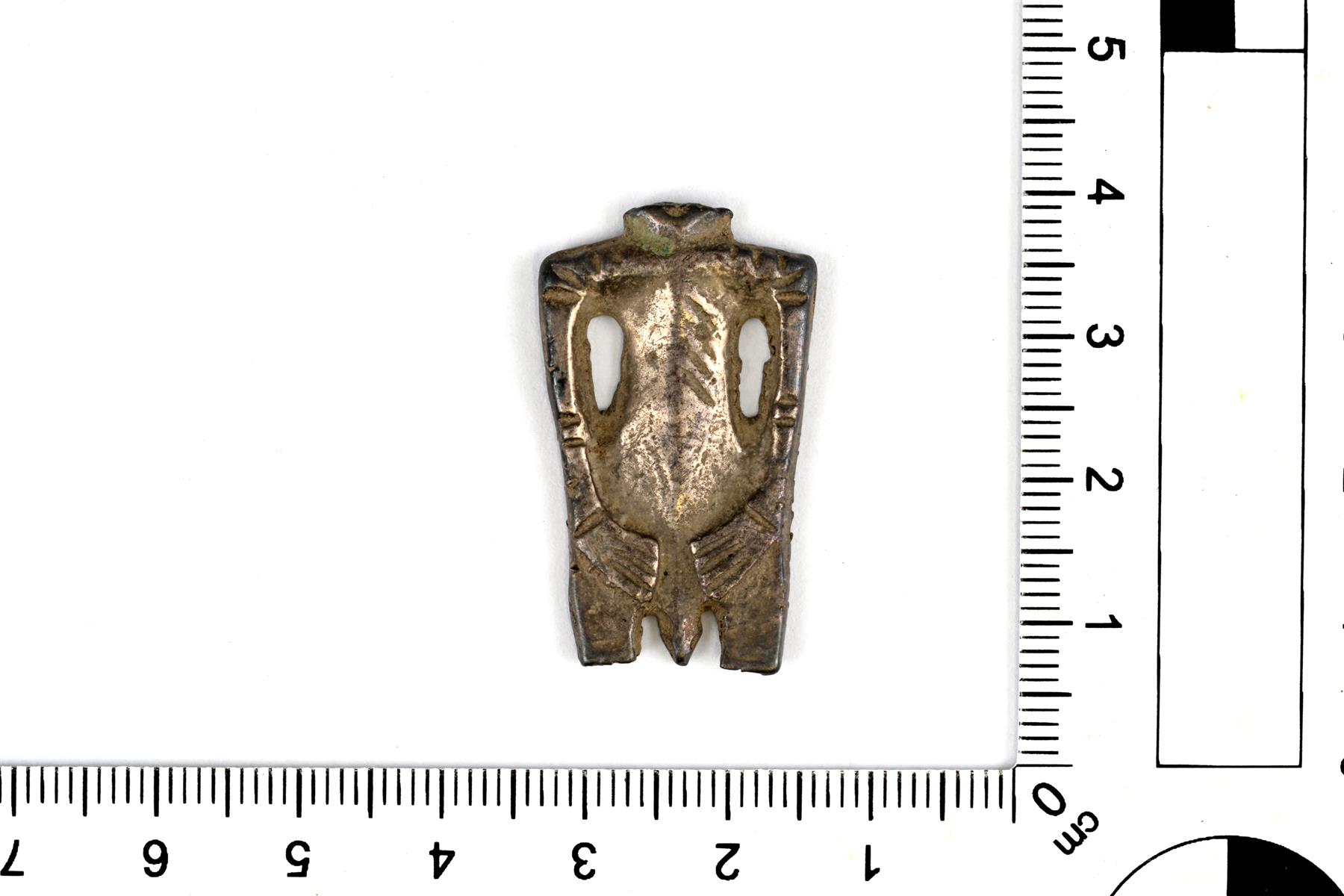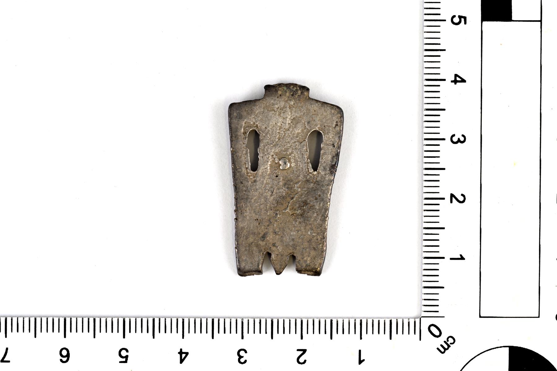 | Levymäisen ihmis- tai jumalfiguurin katkelma (miespuolinen). Pää ja jalat puuttuvat. Kädet ovat lanteilla. Koristelu on melko yksinkertaista viivakuviointia. Taustapuolella on nähtävissä valumuotin halkeamien jättämiä jälkiä. Vastaa muodoltaan permiläisiä esikuvia. Lähin vastine on Aspelin 570. | |