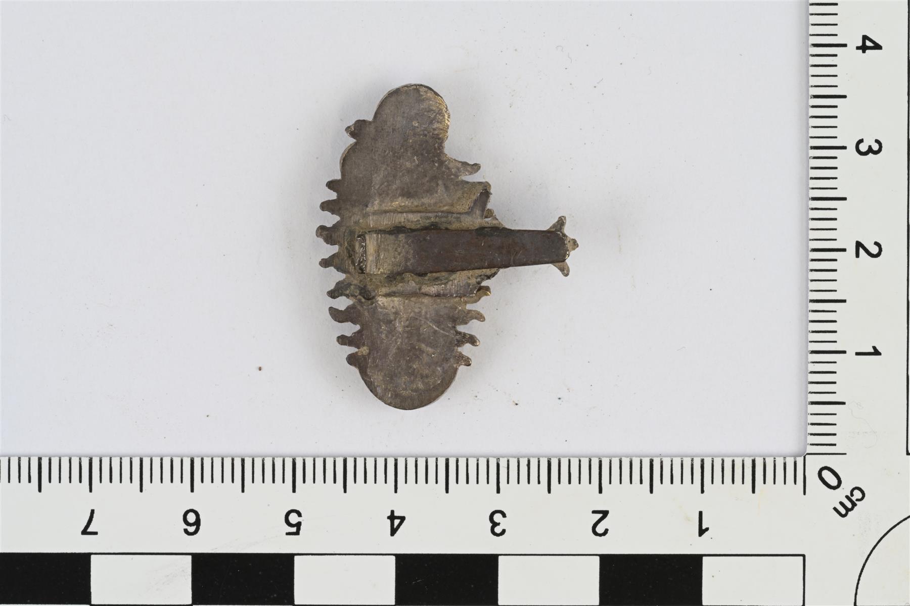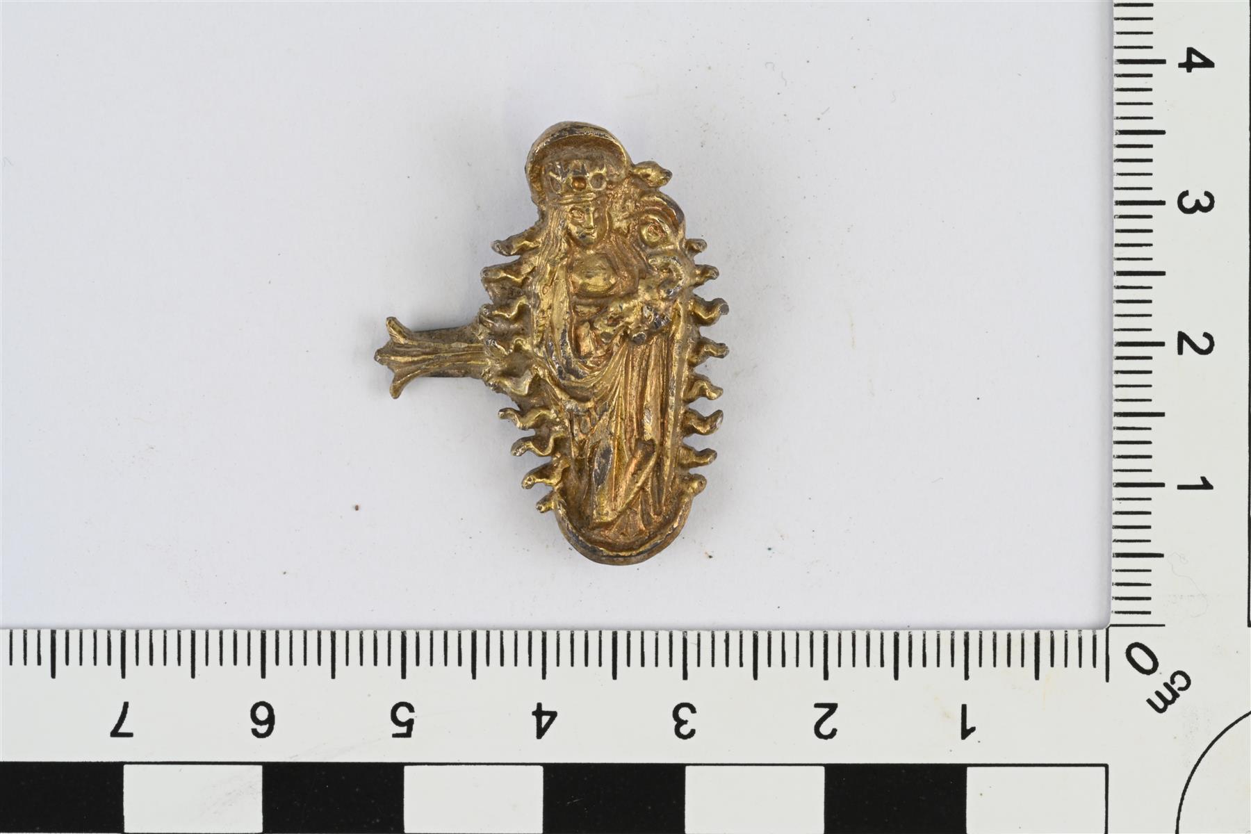 | Madonna-aiheinen esine, luultavasti kirjanhela. Reliefikoristeinen esine, jonka reunat mukailevat kuva-aihetta. Kuva-aiheena apokalyptinen madonna, eli kuunsirpin päällä seisova Neitsyt Maria sylissään Jeesus-lapsi, Marian selän takaa ulkonee sivuille auringonsäteitä. Toisella sivulla lyhyt palmettikoristeeseen päättyvä poikittainen varsi. Varren kohdalle taustapuolelle liitetty varren levyinen kapea levy, jonka pää katkennut. Hopeaa, etupuoli kullattu. | |
