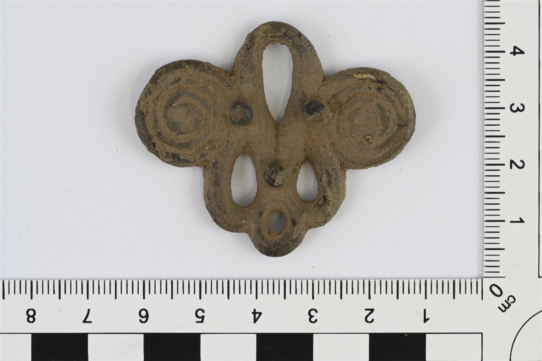 Spiraalipäinen ketjunkantaja. Tappikoristeinen, etupuolella kolme tappia. Paksuus 7 mm mitattu tappien kohdalta, muun osan paksuus 3 mm. | |