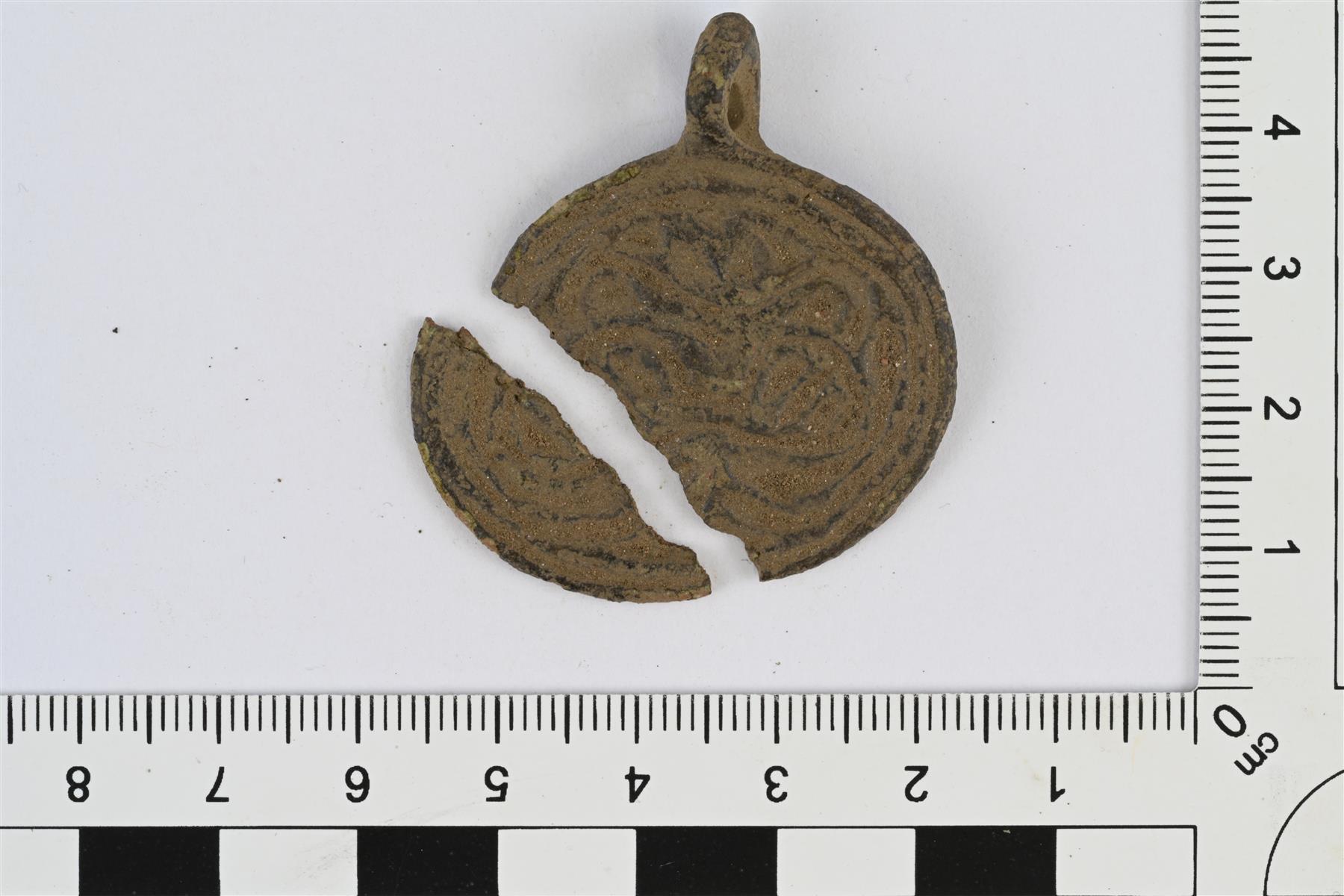 Kahteen osaan hajonnut pyöreähkö riipus. Yläreunassa ripustuslenkki, joka sivusta katsoen vinoneliön muotoinen. Etupuolella nauhapunostyyppistä viivakoristelua. Paksuus 9,5 mm mitattu ripustuslenkin kohdalta, riipusosan paksuus 1,5 mm. | |