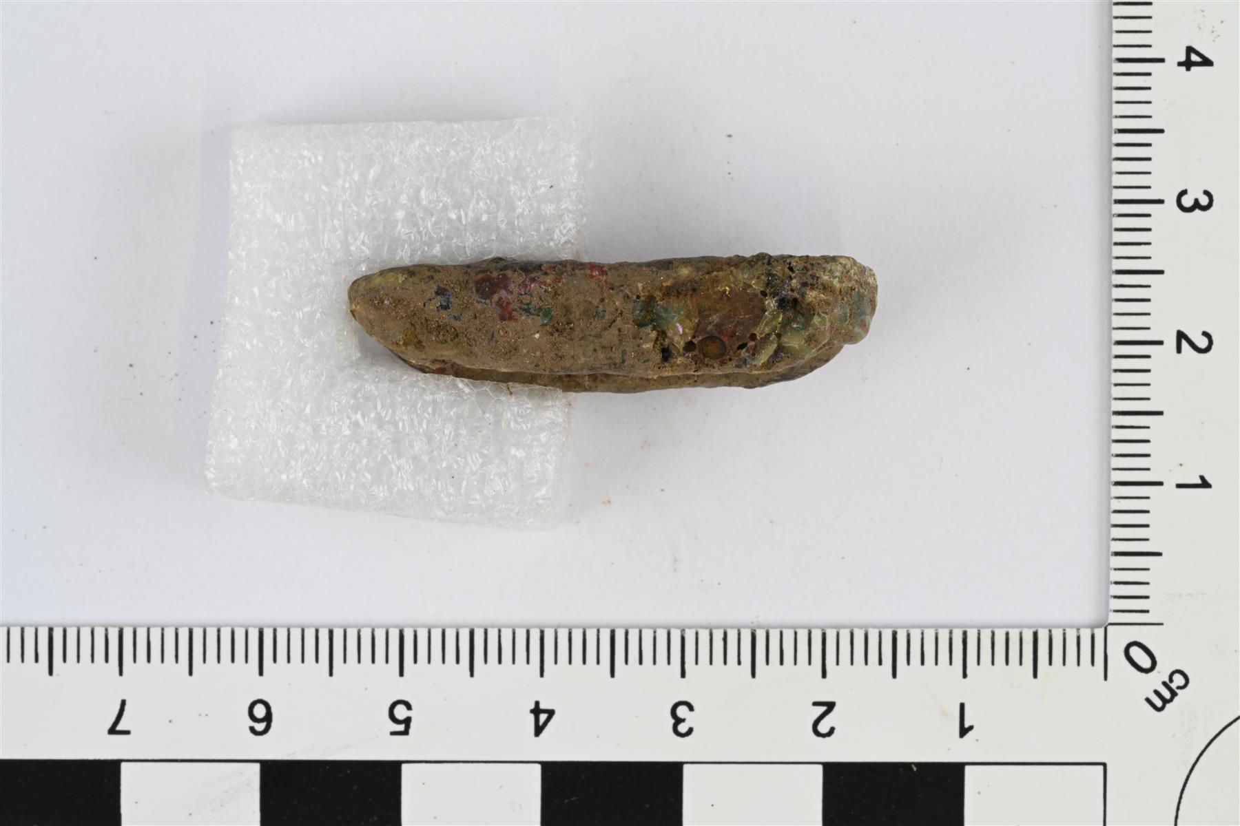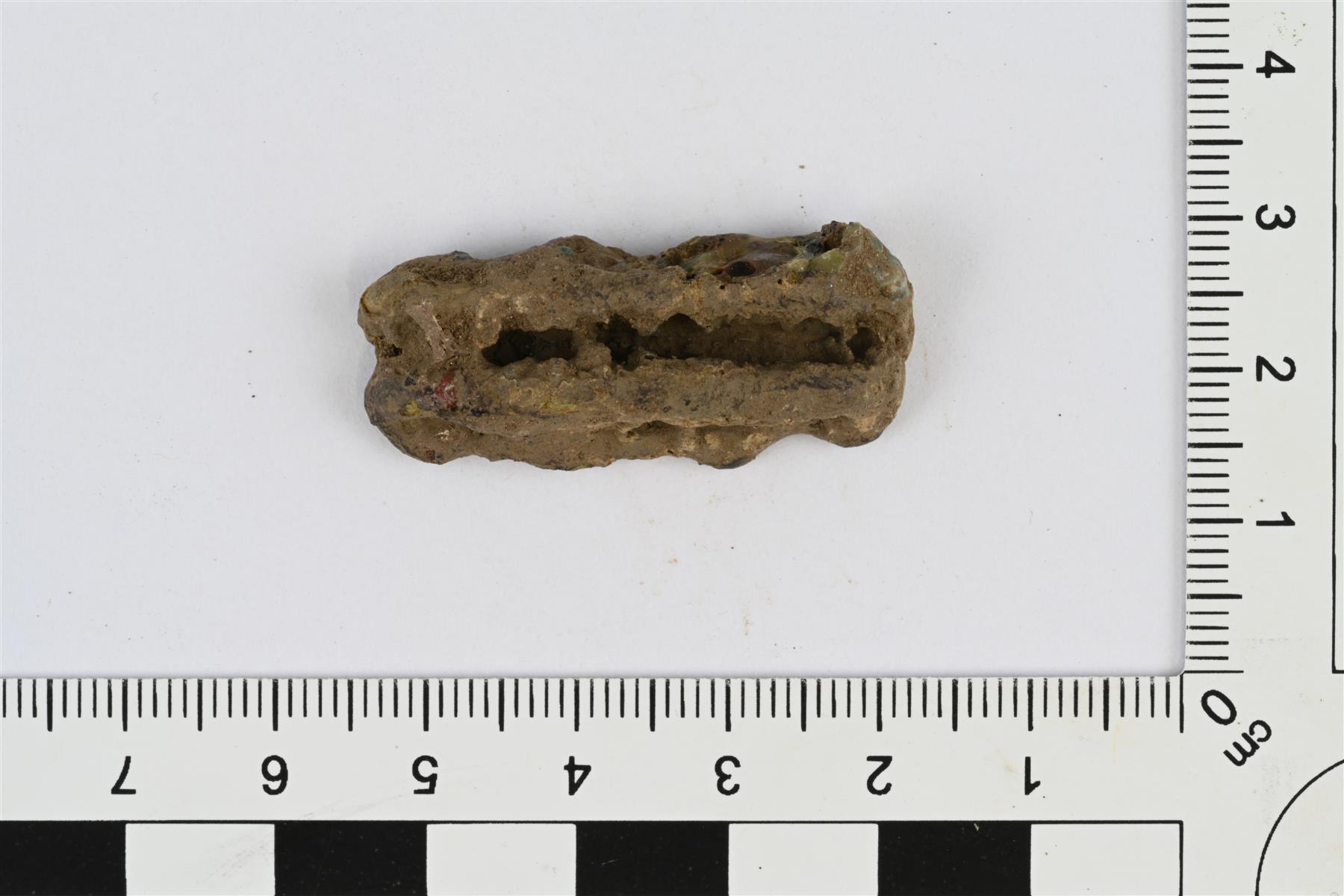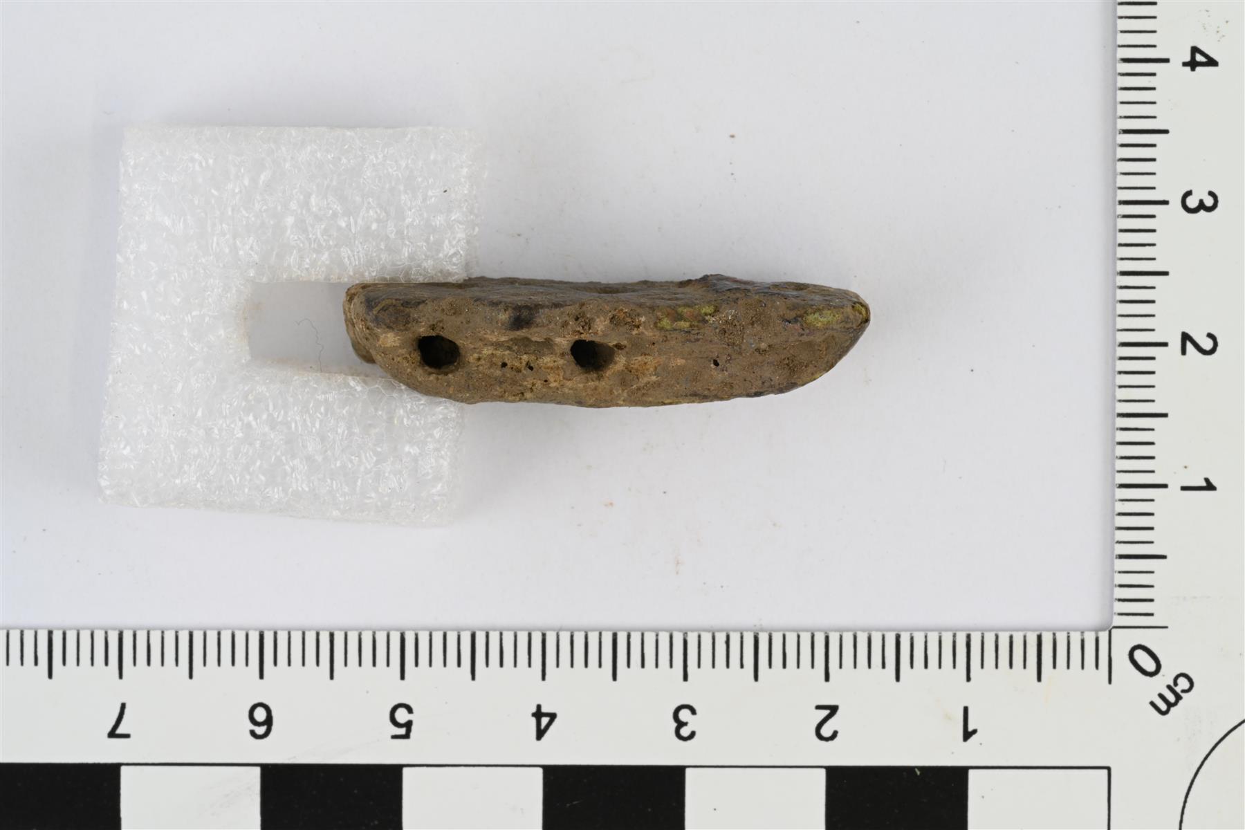 | Ketjunjakaja. Pitkänomainen, litteähkö. Etupuoli koristeltu ja muuta esinettä leveämpi. Taustapuoli kapeampi ja osittain avonainen. Etu- ja taustapuolen välissä pystysuuntaiset reiät, joista kaksi avonaisena näkyvissä. Reikiä on kaikkiaan kolme tai mahdollisesti useampia. Etupuolella koristeluna vinoneliökuvio, jossa myös kuoppia. Osittain sulanut, pintaan sulanut kiinni myös jotakin muuta materiaalia. | |