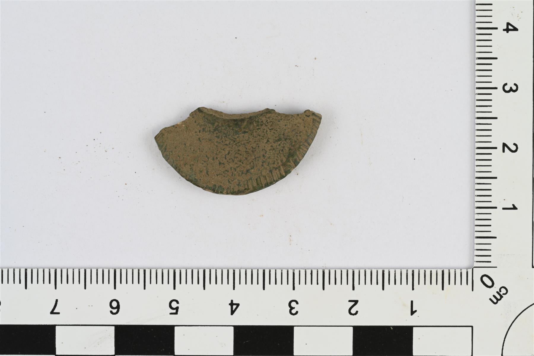 Kupariseosesineen katkelma. Litteä, kaksi kaarevaa reunaa joista toinen kupera ja toinen kovera. | |