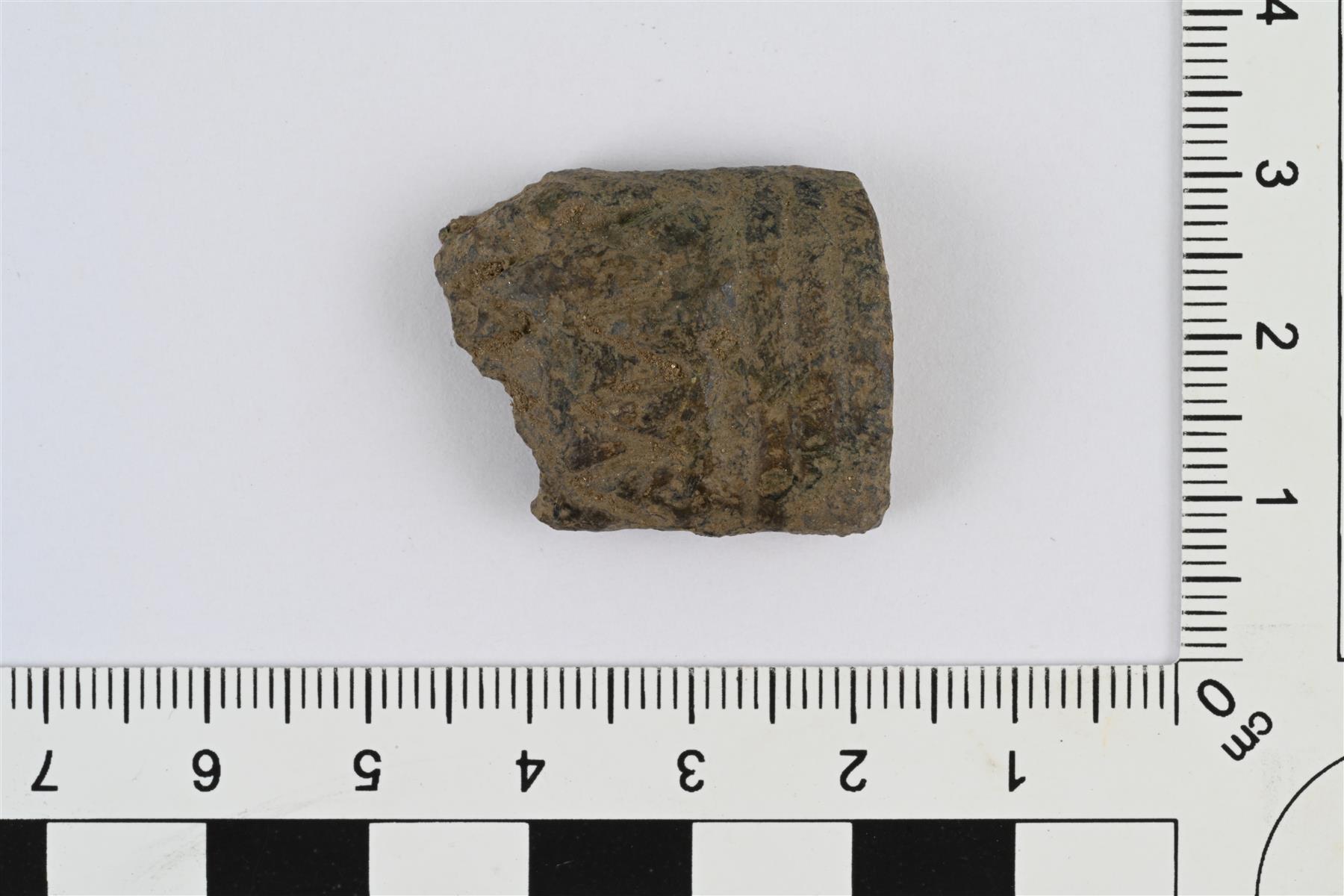 | Massiivisen rannerenkaan päätykatkelma. Poikkileikkauksessa ulkopinta kupera ja sisäpinta tasainen. Päässä urien erottamia poikittaisia vöitä. Muussa pinnassa kulmaviivakoristelua. | |