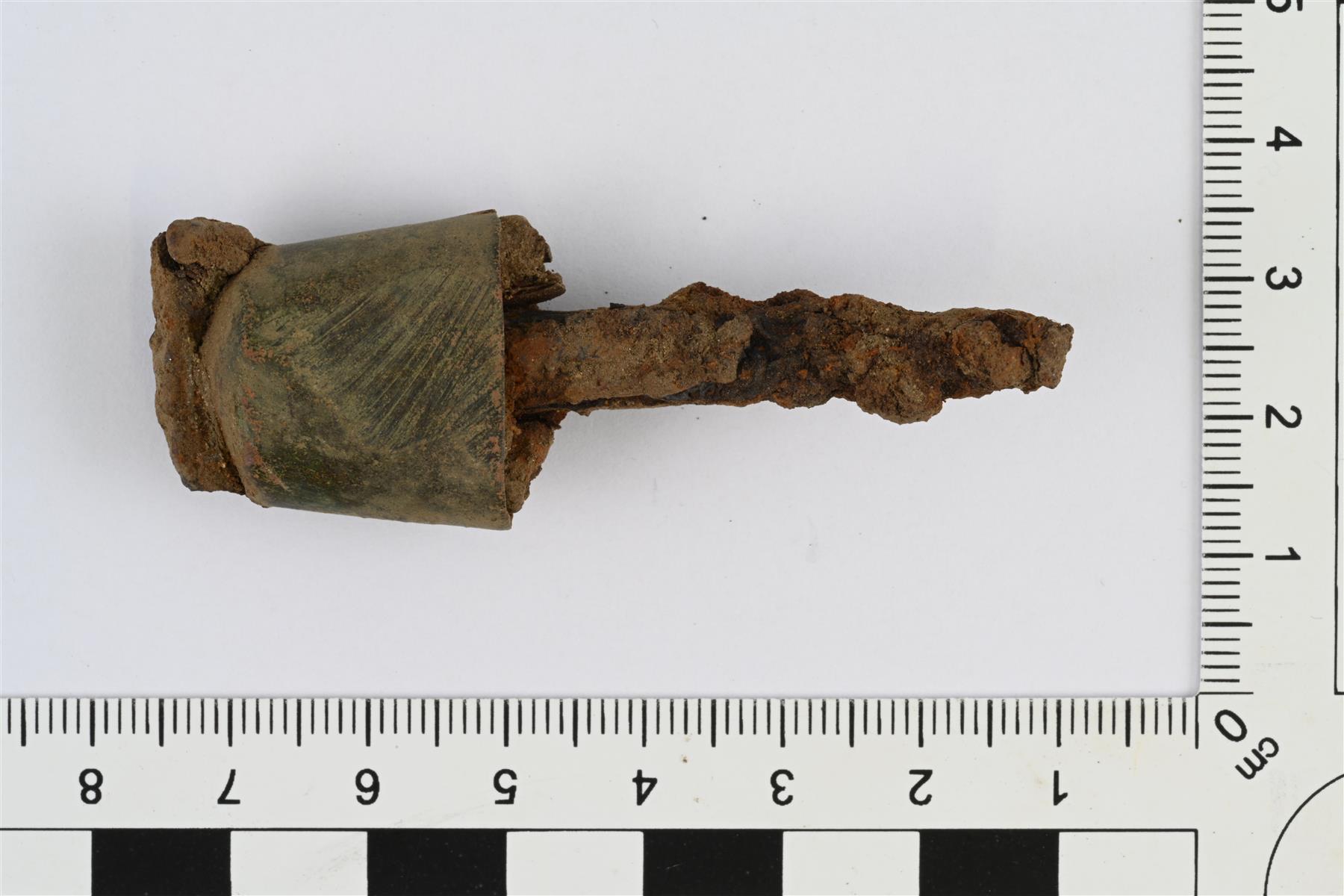 | Puukon tai veitsen katkelma. Jäljellä ruoto, kupariseoksinen alahela ja hieman terää. Hela on ruodon ja terän liitoskohdassa. Hela putkimainen, ohuesta levystä tehty, poikkileikkaukseltaan soikea ja kahvan päätä kohti levenevä. Helan sisällä mahdollisesti jäljellä hieman kahvan materiaalia, luultavasti puuta. | |