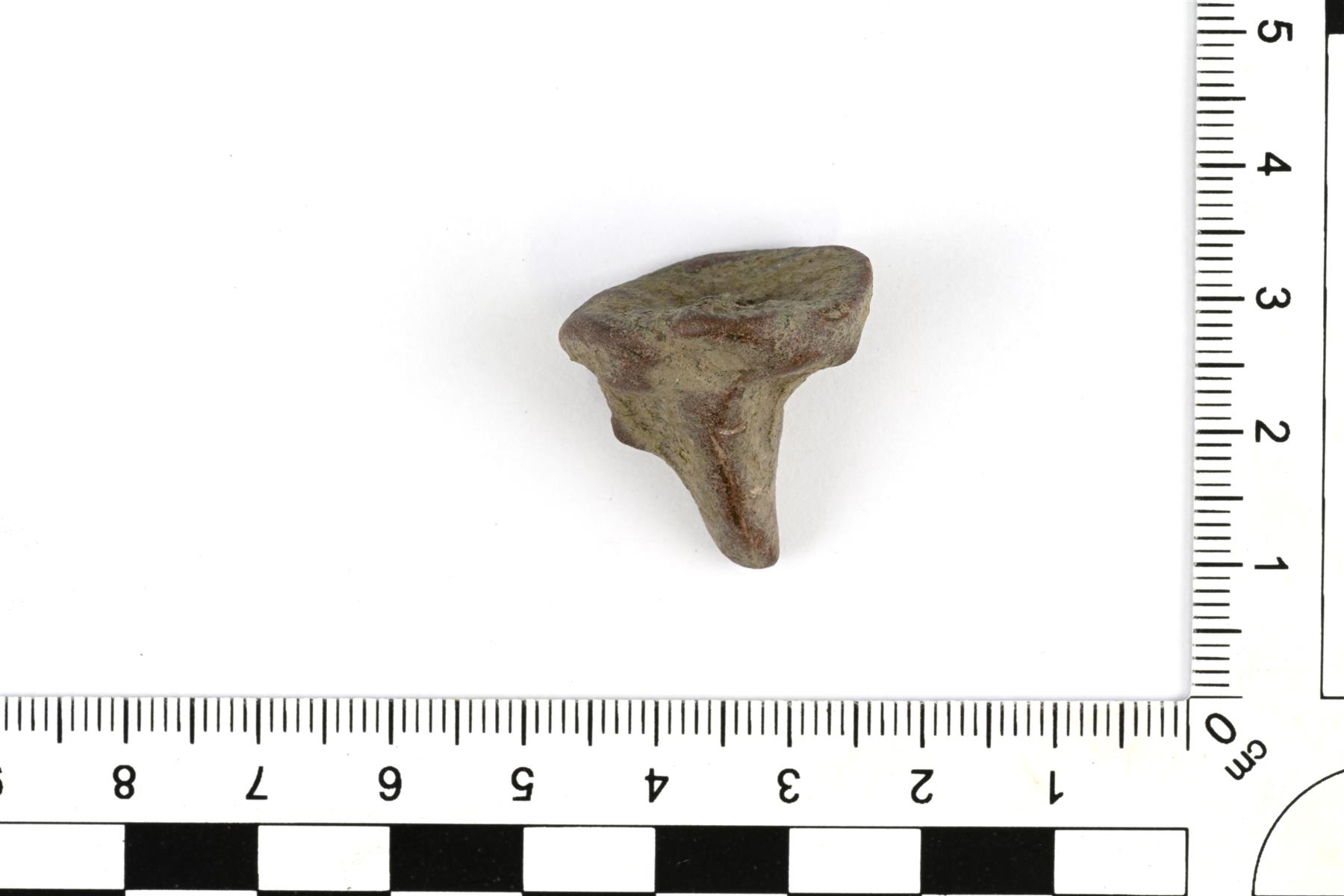 | Metallivalusta jäänyt valutappi. Selkeitä valinsaumoja ei erotu, joten kyseessä on todennäköisesti yksiosaiseen muottiin valetusta esineestä. | |