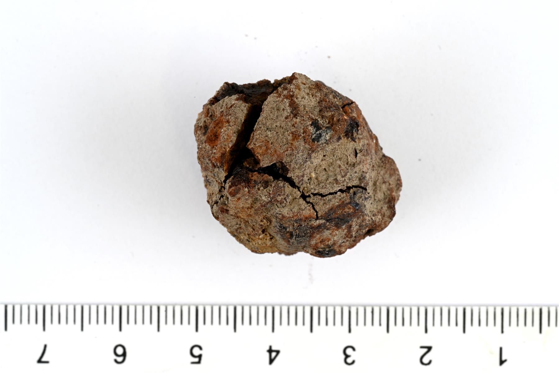 | Pahoin ruostunut kuulamainen punnus. Korroosiokerros on peittänyt suuren osan alkuperäisestä pinnasta, mutta muutamassa kohdassa erottuu kupariseoksista pintaa. | |