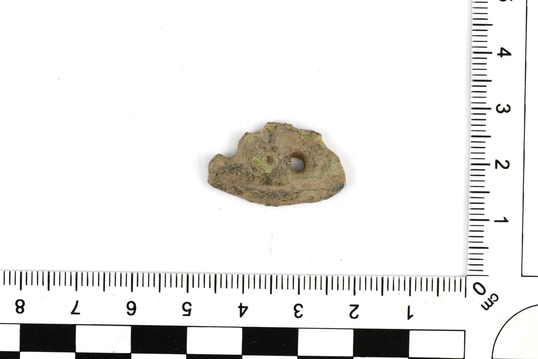 | Pyöreän kupurasoljen reunakatkelma. Koristelusta erottuu pyöreitä reikiä ja tappi. Mahdollisesti C/D tai D-tyypin soljesta. | |