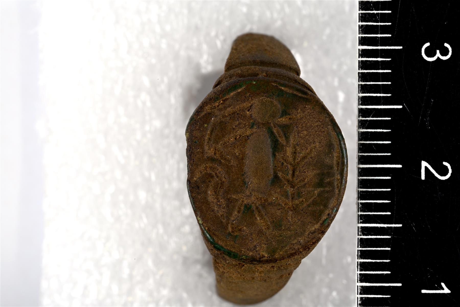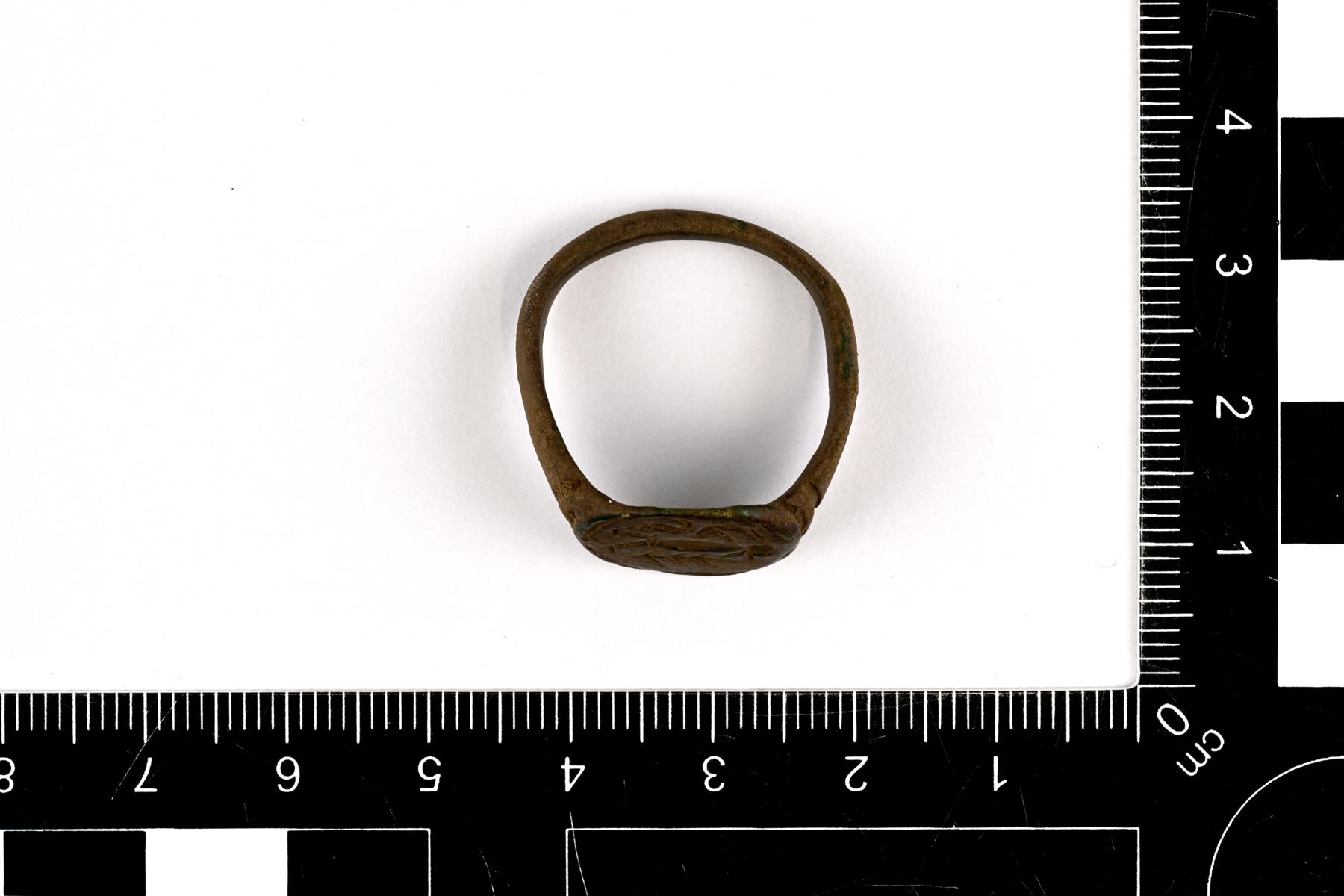 | Kokonaisena säilynyt Sarvas-sormus. Kanta on ovaali ja siinä on kuva-aiheena ihmishahmo ja jonkinlaista havuornamentiikkaa. Kannan molemmilla puolilla on viivauurteet. Vrt. Sarvas (1973) kuva 2. | |