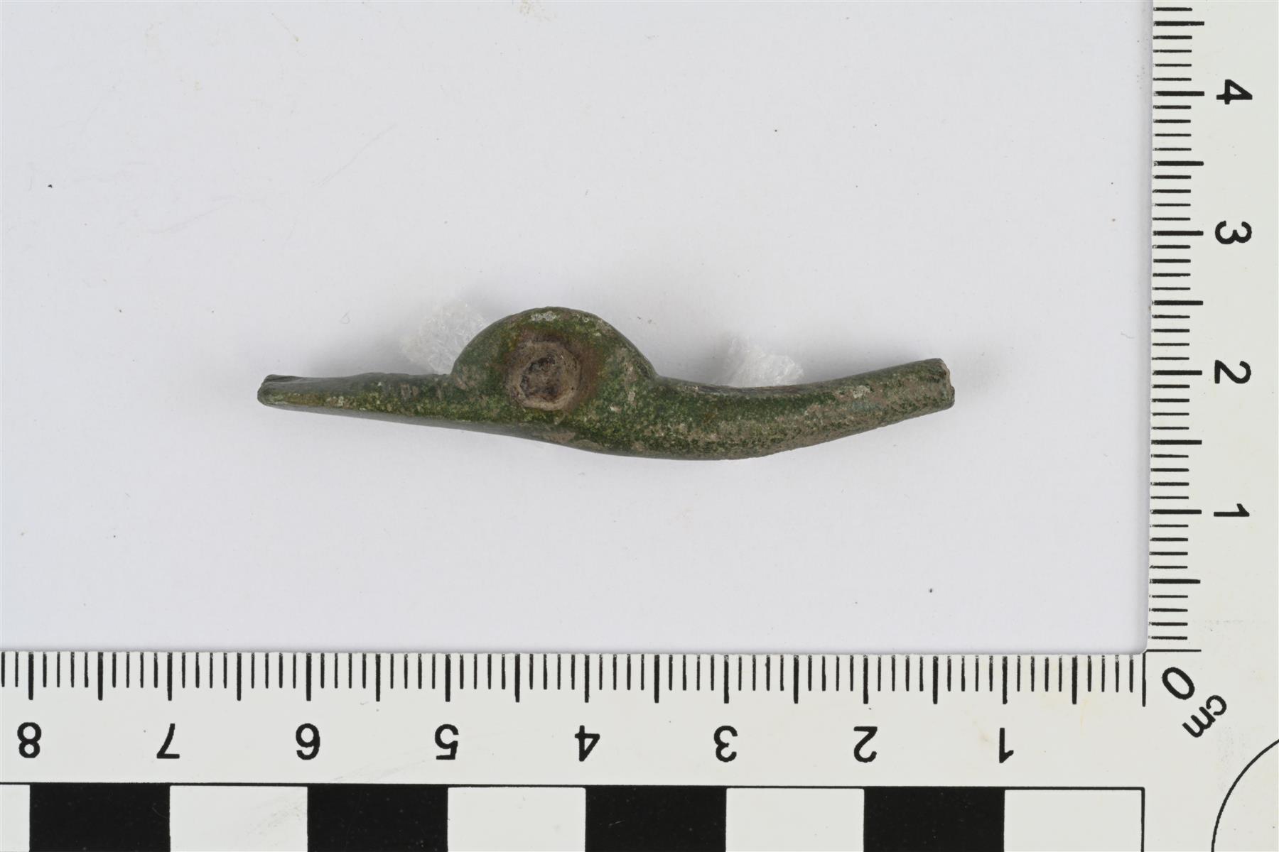 | Katkelma luultavasti kolmioneulan varresta. Ohut ja pitkänomainen katkelma, jonka toinen pää poikkileikkaukseltaan pyöreä, toinen pää levenevä ja litistyvä. Päiden välillä katkelman keskivaiheilla puoliympyrän muotoinen litteä ulkonema, jossa reikä. Reiässä kiinni korrodoituneen rautarenkaan tai -vartaan katkelma. Vrt. Kivikoski 1973, Abb. 440, 448, 721. | |