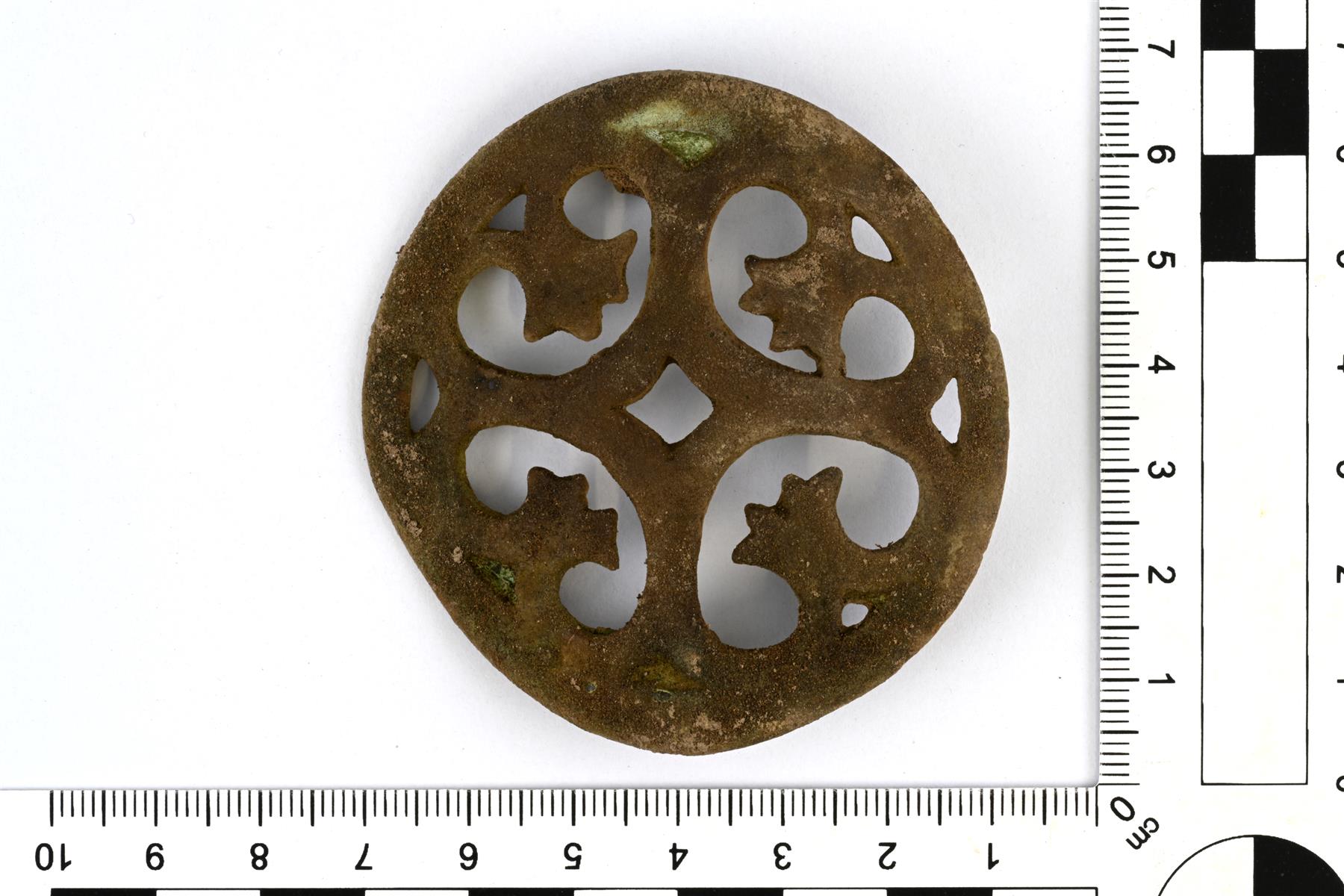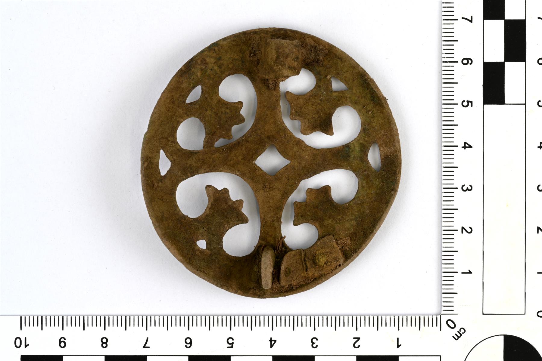 | Pyöreä ratassolki. Heiman vääntynyt. Koristeltu puhkonaisilla kuvioilla. Taustapuolella on säilyneenä neulakota ja toinen jousilaitteen kiinnityslenkeistä. Taustapuolella on myös merkkejä korjaamisesta ja puuttuva kiinnityslenkki on korvattu niitatulla kupariseospellin palalla. Vrt. Kivikoski Abb. 426. | |