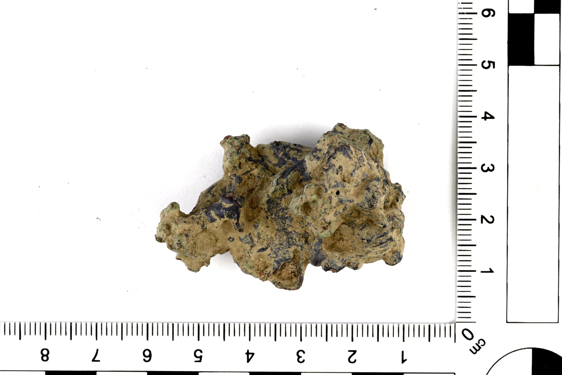 Epämääräisen muotoinen sulaneen kupariseoksen kappale. | |