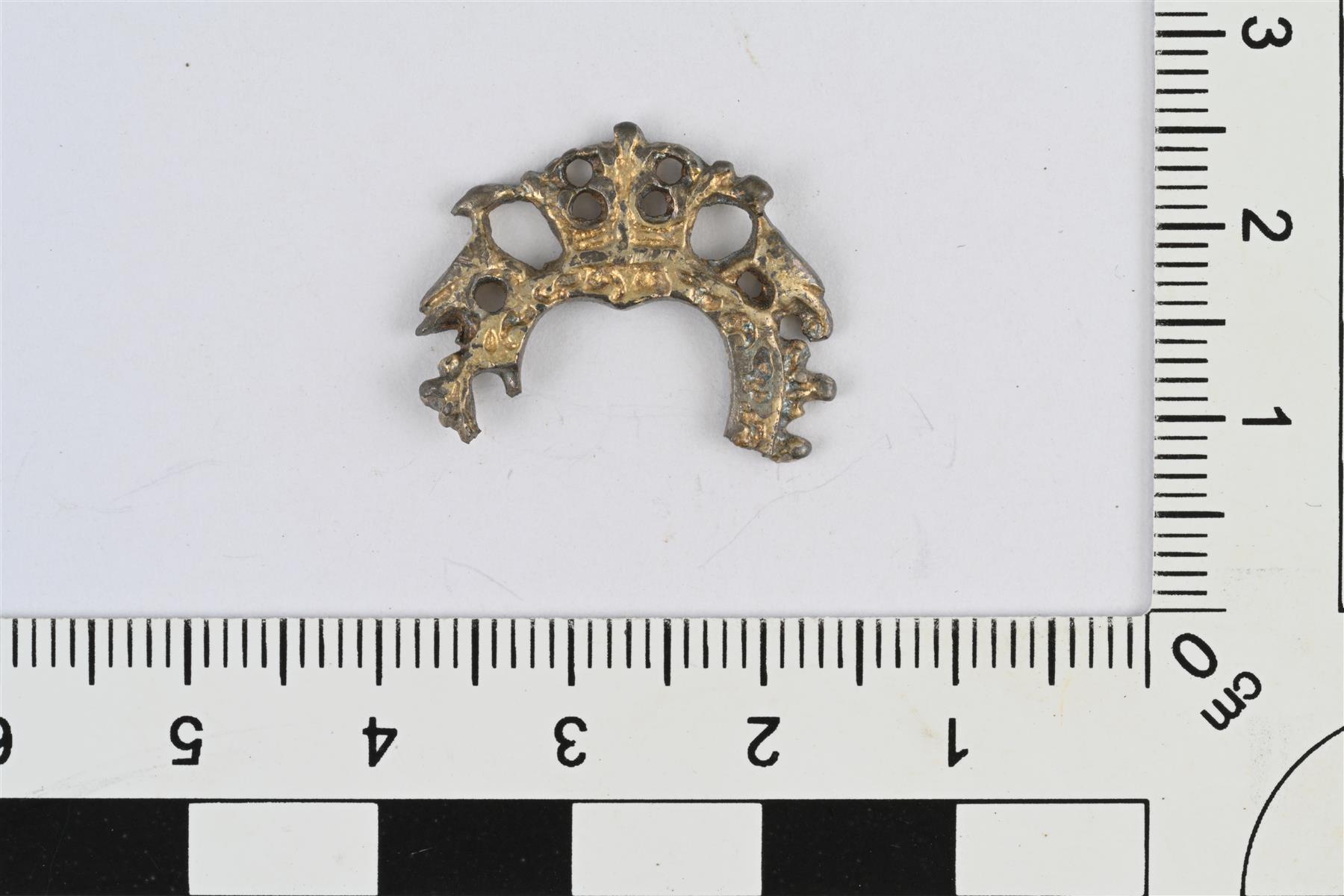 Koristellun sydänsoljen katkelma, kehän yläosa. Hopeaa, pinnassa ilmeisesti kultauksen jäänteitä. Kehän ulkopuolella puhkonaista koristelua, jossa keskimmäisenä kruunu ja sen molemmin puolin nelijalkaiset eläimet pää kruunuun päin. | |