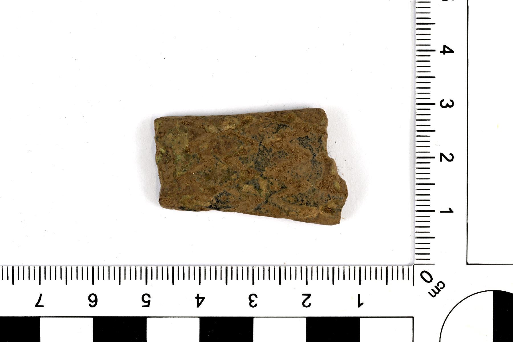 | Päihin levenevän massiivisen rannerenkaan katkelma. Poikkileikkaus on etupuolelta kupera ja taustapuolelta suora. Koristeluna vinoneliöiden muodostama kenttä. Vrt. Kivikoski Abb. 735. | |