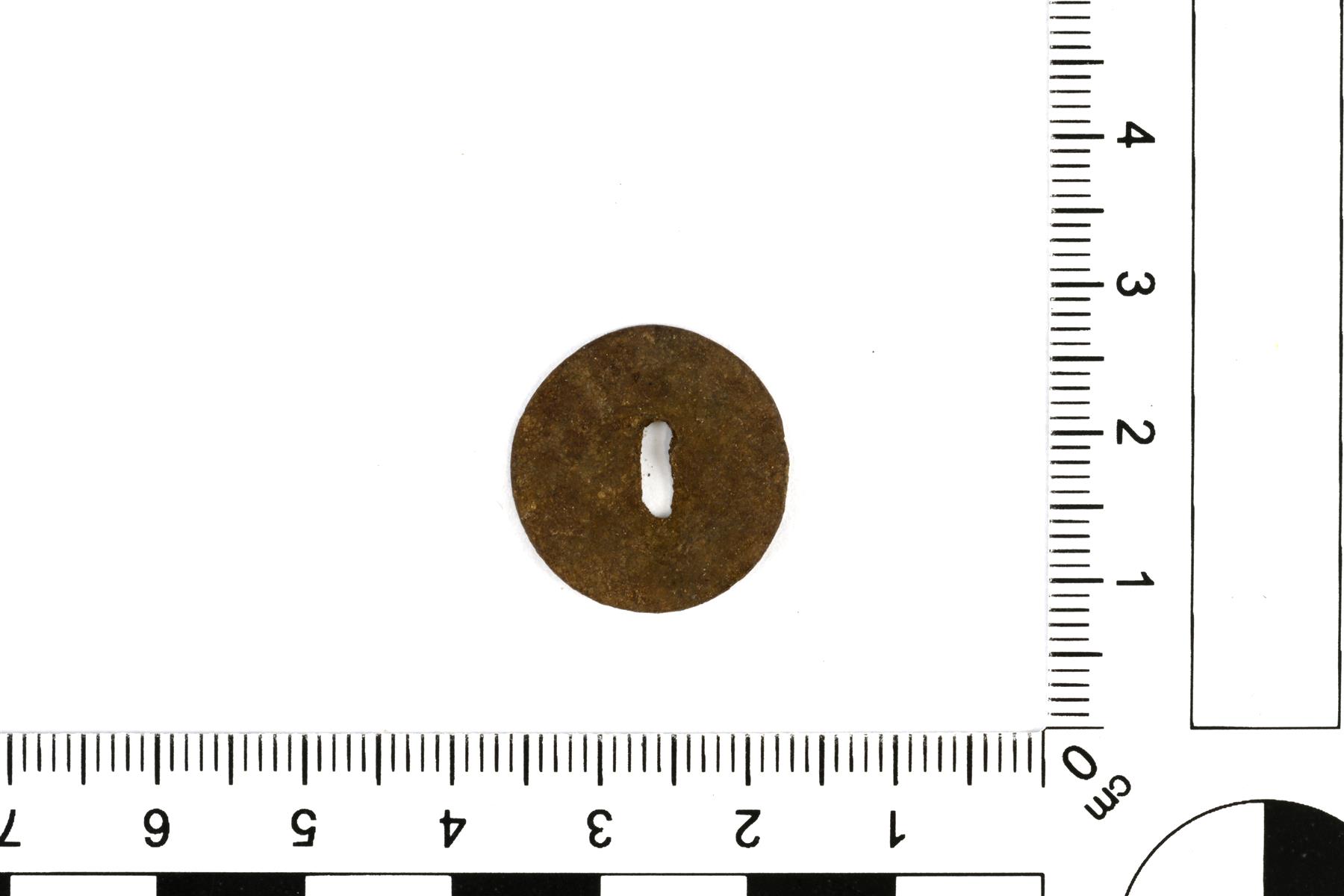 | Pyöreä nappi. Kiekkomainen. Hajonnut keskeltä. | |
