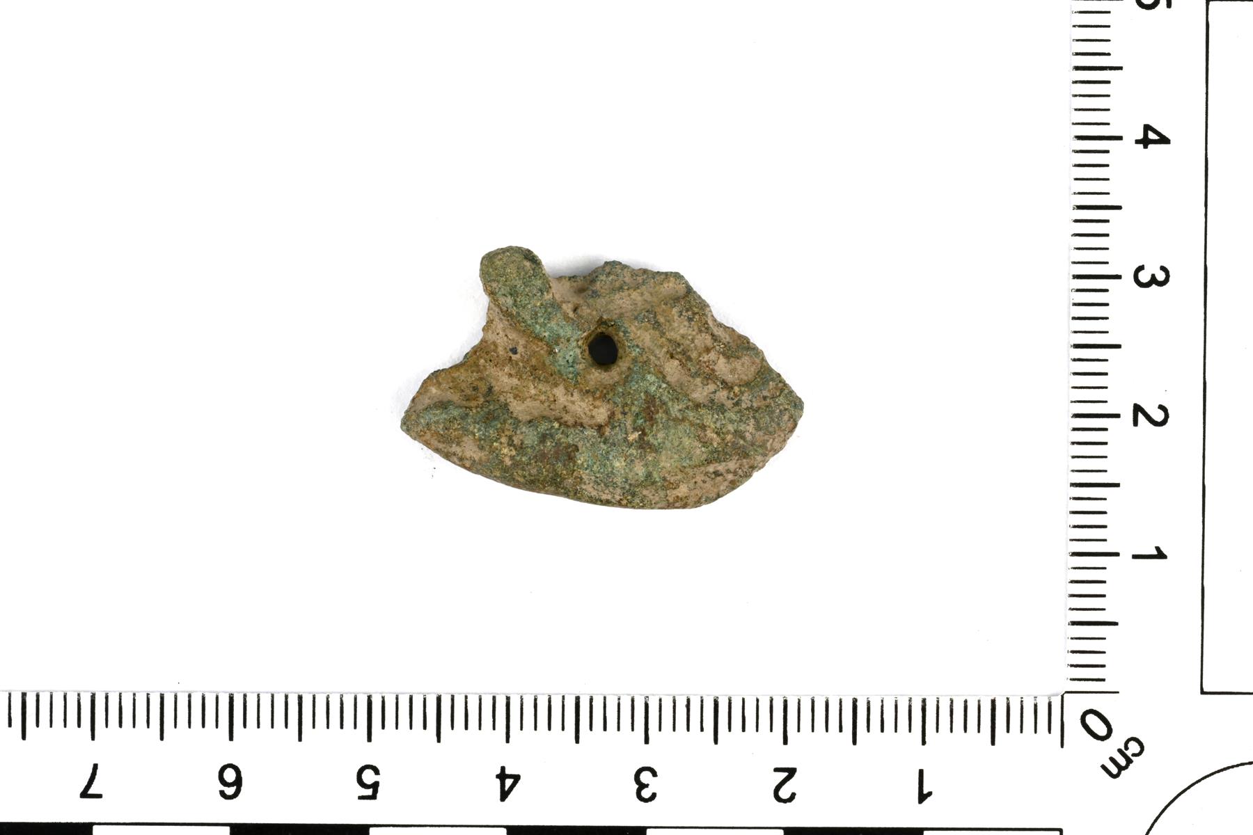 | Pyöreän kupurasoljen reunapala. Sulanut voimakkaasti. Etupuolella on säilyneenä hieman viivauurteilla tehdystä nauhakäärmeestä ja pyöreä reikäkuvio. Todennäköisimmin C/D tai D-tyypin soljesta. | |