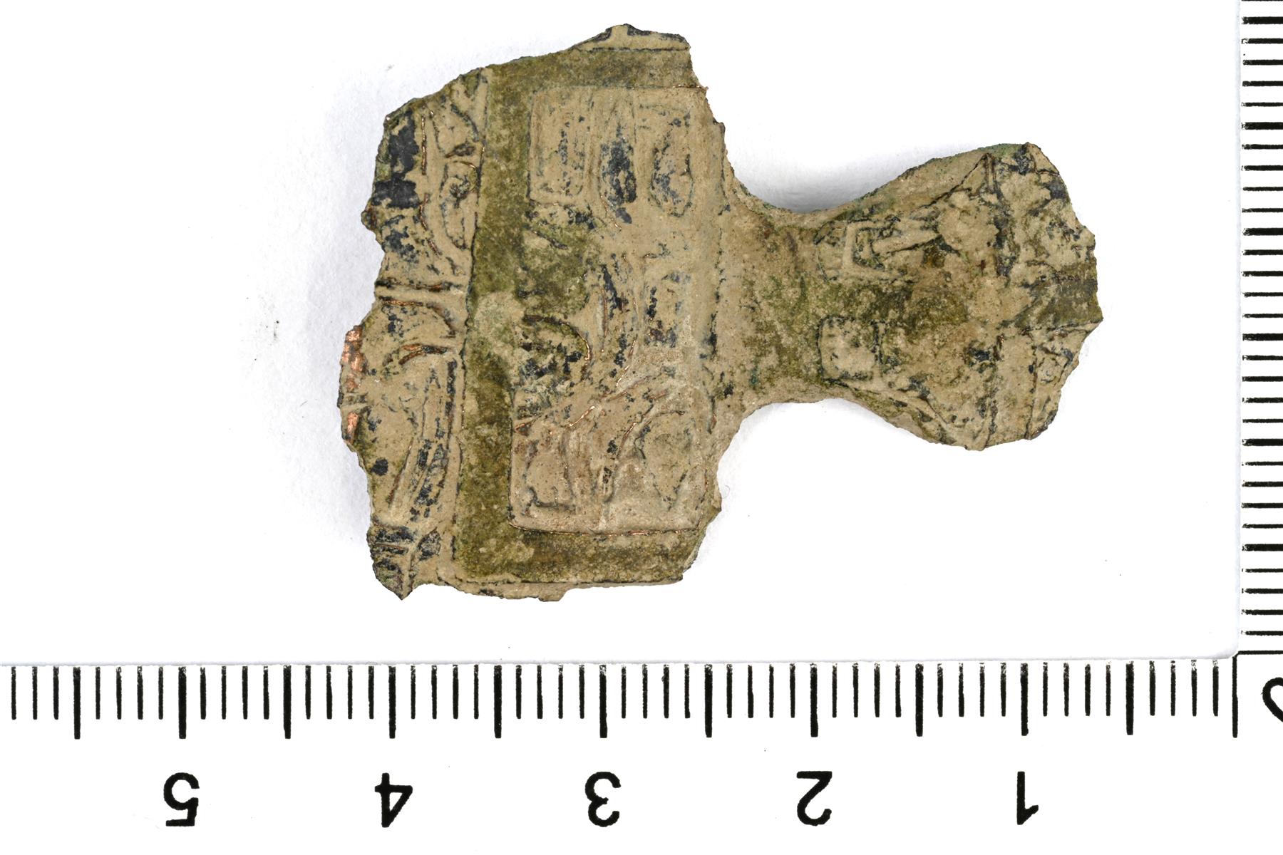| Reliefisoljen pään ja kaaren yläosan katkelma. Päätylevy on alun perin ollut muodoltaan suorakaide. Päätylevyn ja kaaren liitoskohdassa on kavennus. Koristeltu Salin I -tyypin ornamentiikalla. Taustapuolella oleva jousilaitteen kiinnityslenkki on hajonnut. Pinnassa ei ole kultausta. Solkeen kuuluu todennäköisesti aiemmin luetteloitu reliefisoljen jalkakatkelma KM 44622: 1, joka löytyi n. 50 m päästä. Vrt. myös KM 19807:1 | |