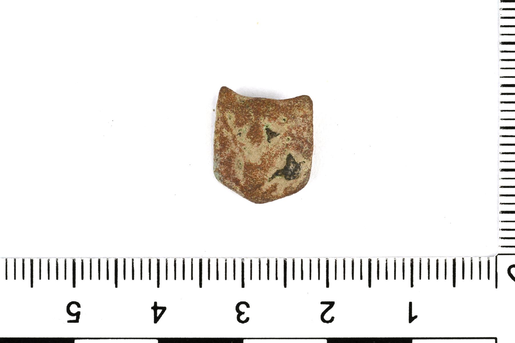 | Kilvenmallinen vyönhela. Pinta on hyvin kulunut. Taustapuolella on kiinnitysniitin tyvenen jäänne. Vrt. Kivikoski Abb. 915 ja 916. | |