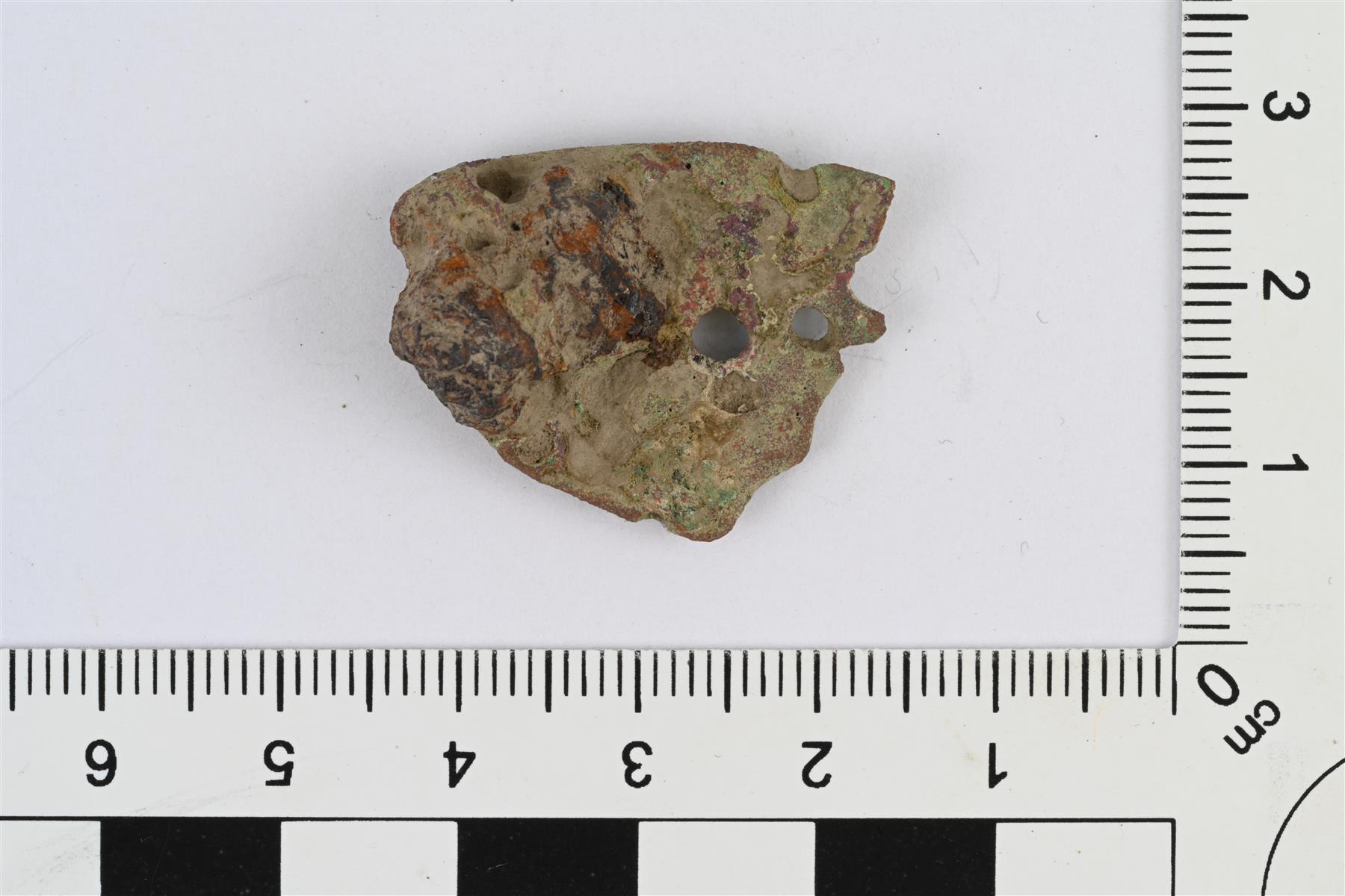 | Pyöreän kupurasoljen reunakatkelma. Kaksi reikää. Taustapuolella neulanpidin, jossa jäänteitä raudasta. Pinta hyvin kulunut. Mahdollisesti ollut tulessa. Paksuus 10 mm mitattu neulanpitimen kohdalta, kuoren paksuus 2 mm. | |