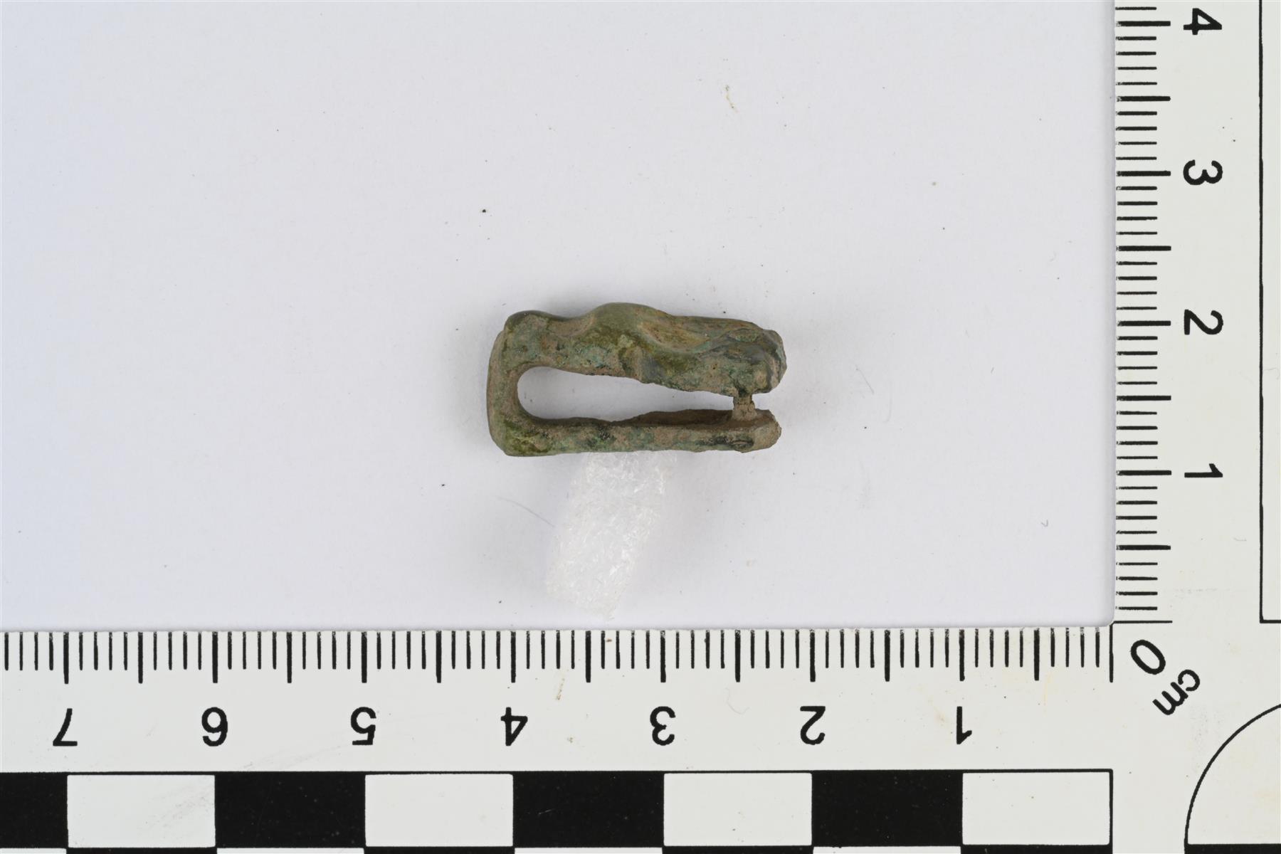 | Pieni hihnanjakajan hela. Etupuolen varsi levenevä ja koristeltu. Varsien päitä yhdistää ohut niitti. | |