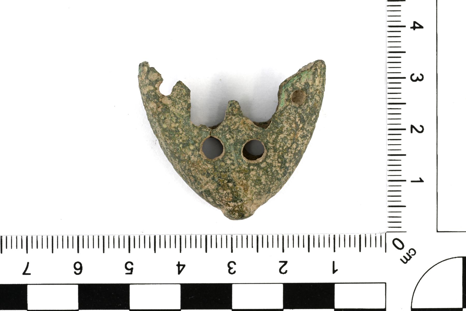 | Miekan huotran kenkäin. Etu- ja taustapuolella on pareittain olevat reikäkuviot. Alaosassa on pieni nappimainen ulkonema. Reunoilla on pienet reiät kiinnitystä varten. Vrt. Kivikoski Abb. 848 ja 1173. | |