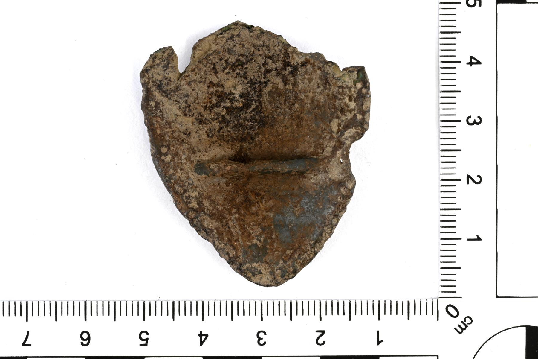 | Soikean kupurasoljen puolikas. Etupuolella on koristeena viivauurteilla tehtyä nauhaornamentiikkaa. Reunoja kiertää poikittaisviivojen muodostama kenttä. Taustapuolella on jousilaitteen kiinnitystä varten poikittainen tanko (Ailion tyyppiä CC2), jonka kiinnityksestä erottuu ulkopinnasta kaksi kuopannetta. Vastaa Ailion F-tyypin solkia (F1 tai F2). Vrt. Kivikoski Abb. 1058. | |