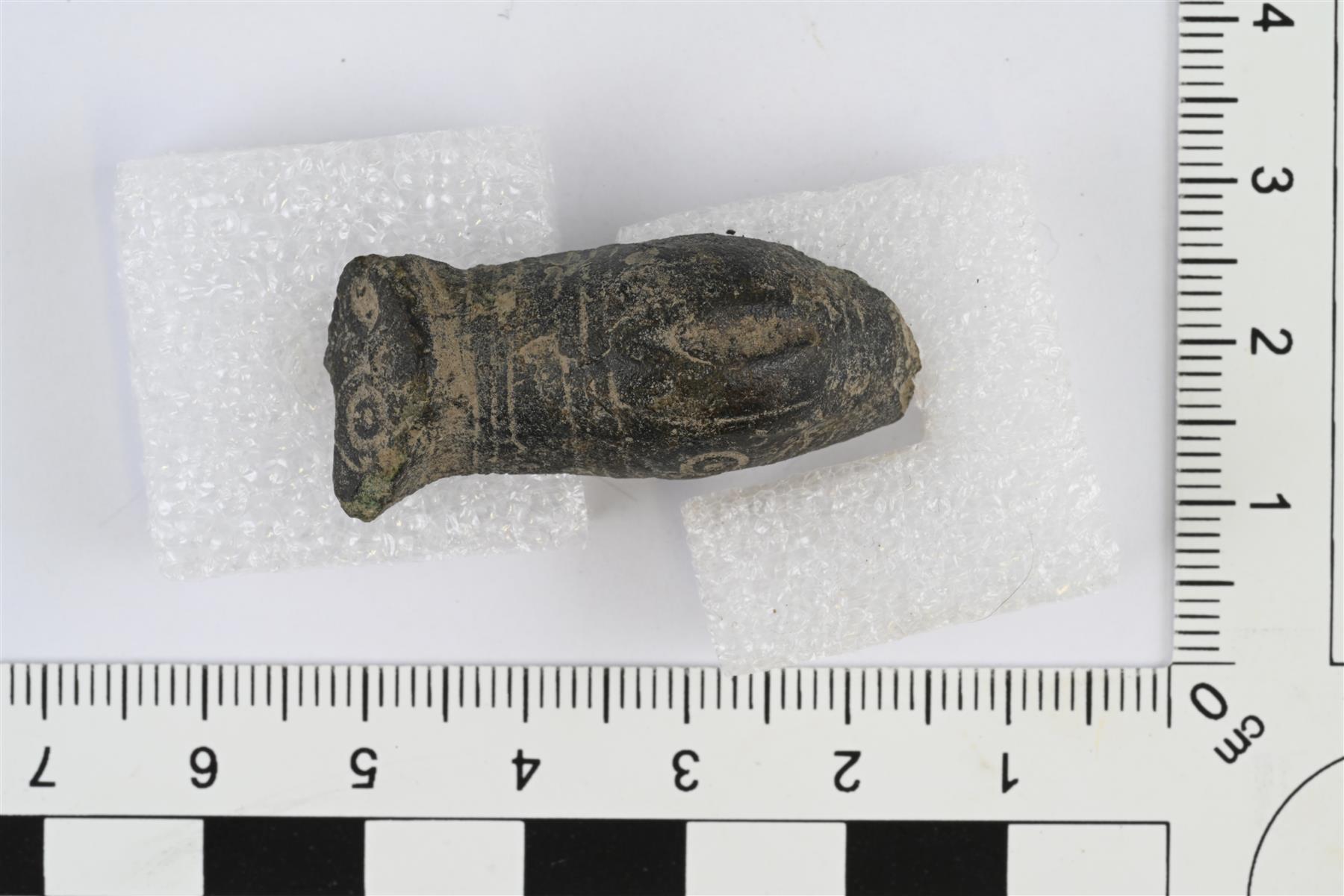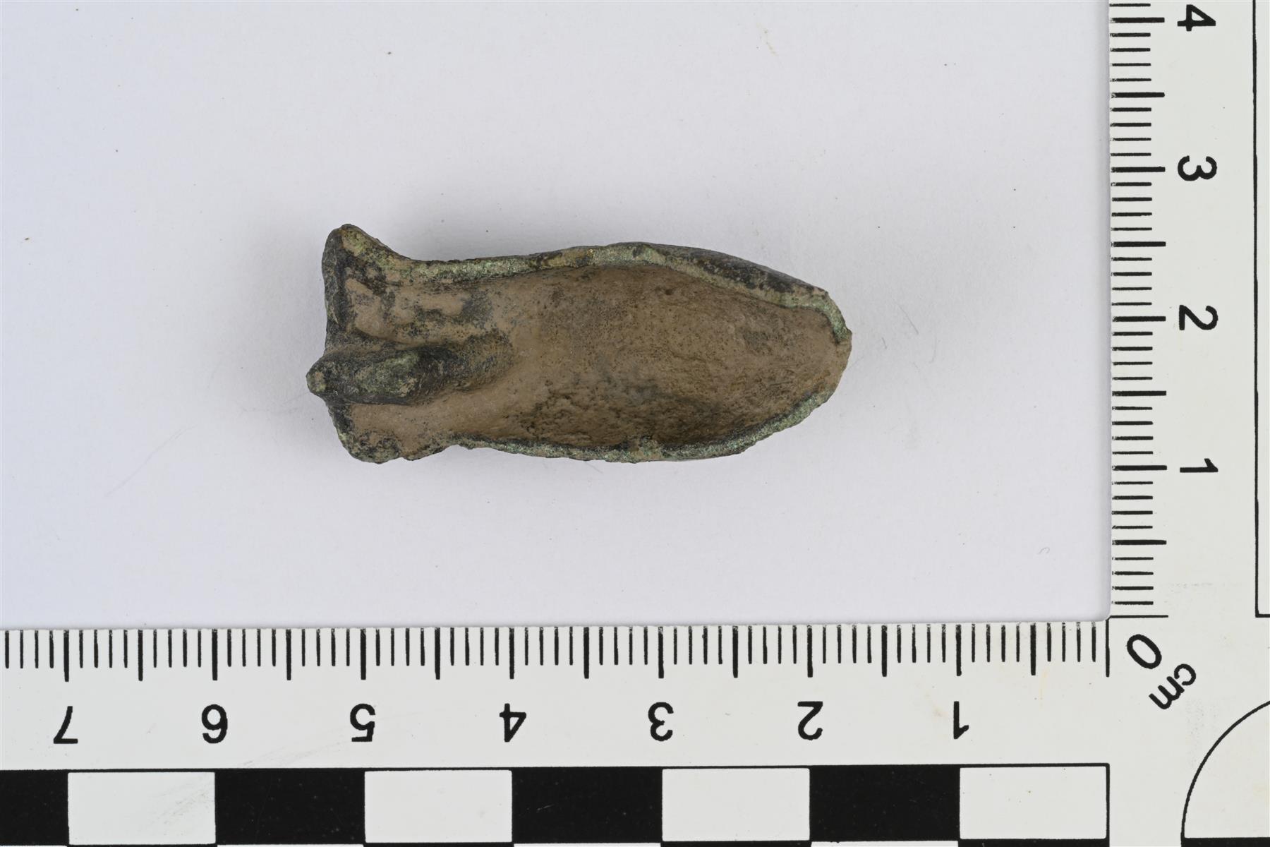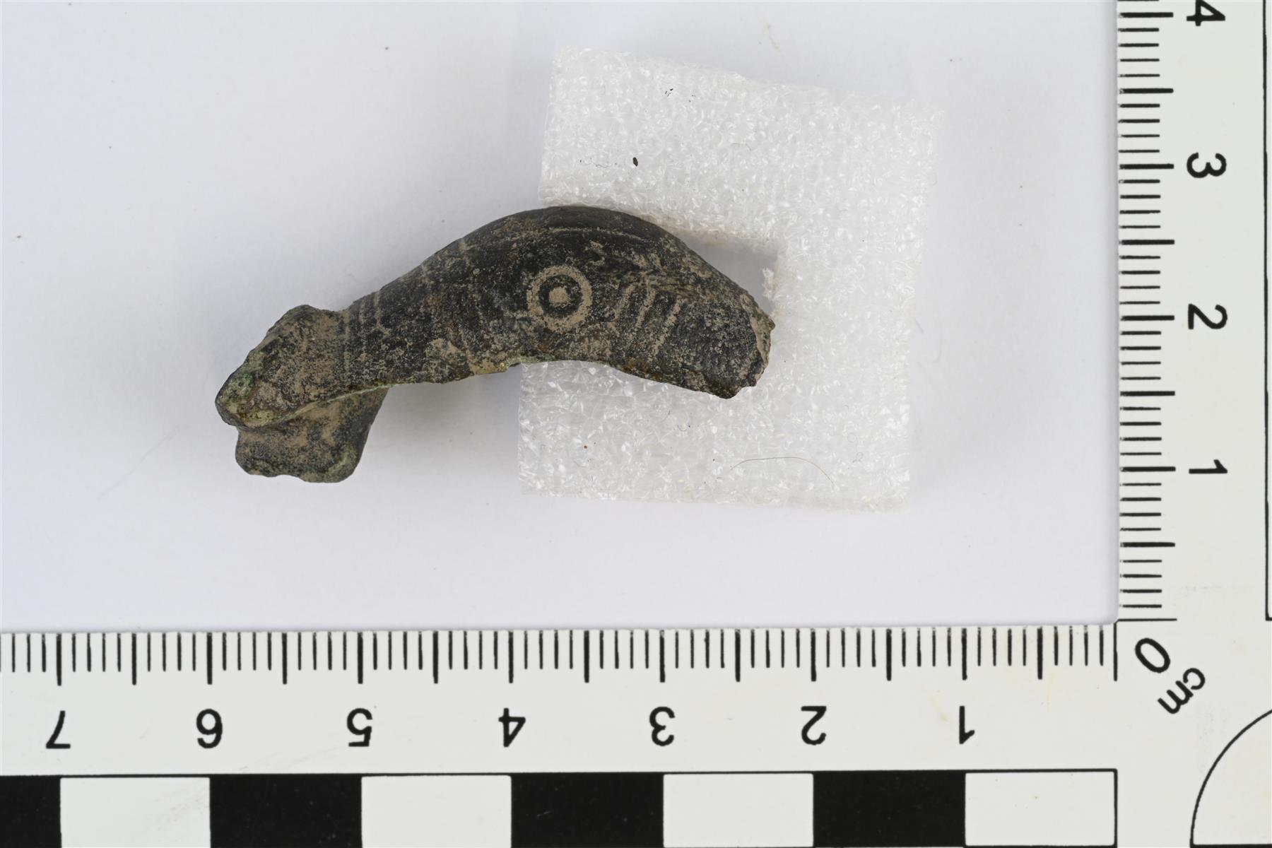 | Tasavartisen soljen katkelma, jossa soljen toinen pää ja suurin osa keskiosasta. Keskiosan keskellä pitkänomainen soikea syvennys. Päiden ja keskiosan välissä poikittaisia viivauurteita. Ehjässä päässä sekä toisessa sivussa häränsilmäleimat. Taustapuolella jousilaitteen jäänne. | |