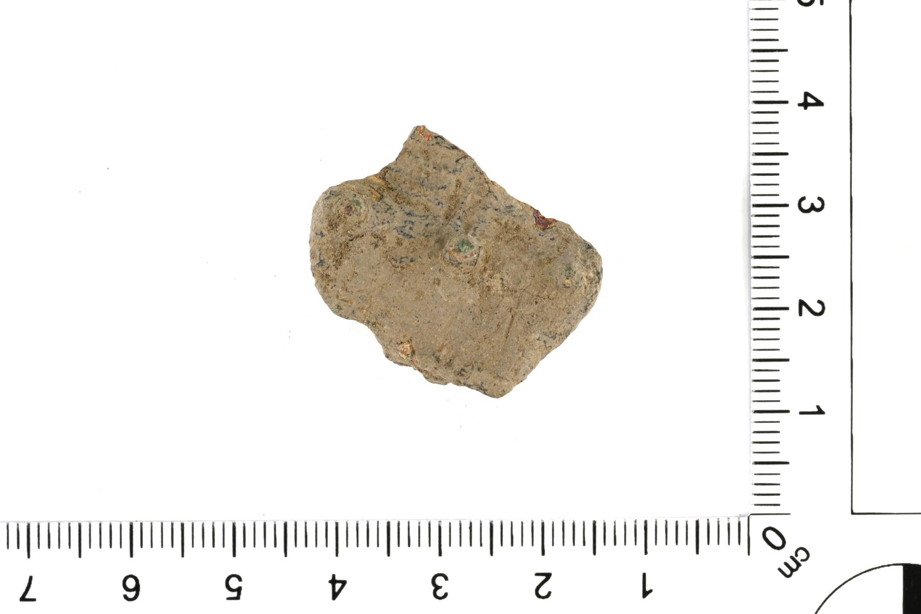 | Tasavartisen soljen päätykatkelma. Koristeluna tappeja ja viivaornamentiikkaa. Taustapuolella on säilynyt kumpikin jousilaitteen kiinnityslenkki. Muistuttaa eniten Kivikosken ryhmän 7 solkia. Vrt. Kivikoski Fig. 14-16. | |