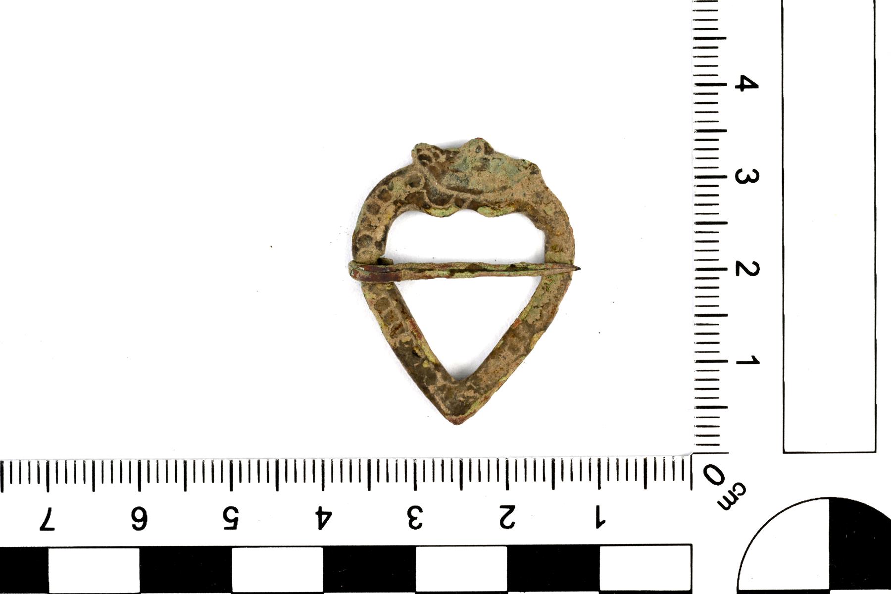 | Kokonaisena säilynyt herttasolki. Yläreunassa on koristeena kruunu ja kehää kiertää helmikuviointia. Pinta on melko kulunut. | |