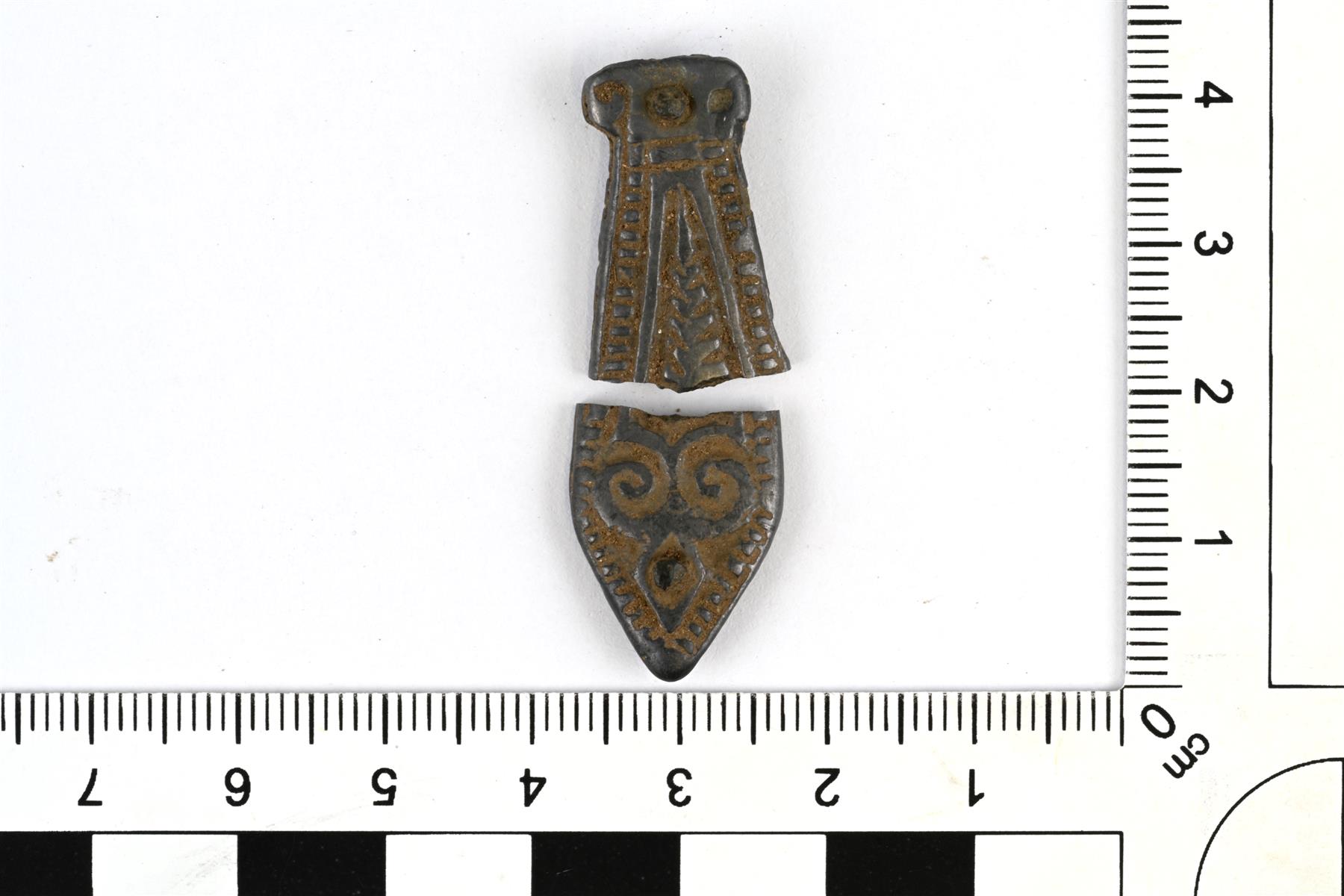 | Kahteen osaan katkennut vyön tai hihnan päätehela. Koristeltu piste- ja palmettiornamentiikalla, jotka on toteutettu kohokuvioina. Molemmissa päissä on pienet kiinnitysniitit. Vrt. Kivikoski Abb. 926. | |