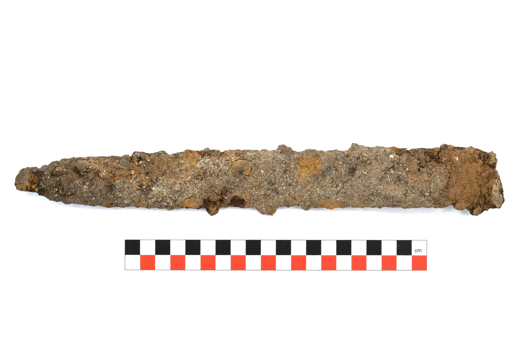 Kaksiteräisen miekan säilän kärkikatkelma. Katkaistussa päässä on merkkejä taivutuksesta, joten kyseessä on todennäköisesti kalmistolöytö. Hauraan korroosiokerroksen peitossa. | |