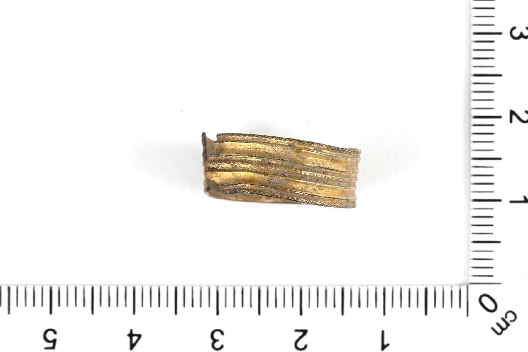 | Umpisormus. Koristeltu reunan suuntaisin nyöri- ja kohoviivoin. Kehä on murtunut auki. Pinnassa on kultaus. Ei leimoja. | |