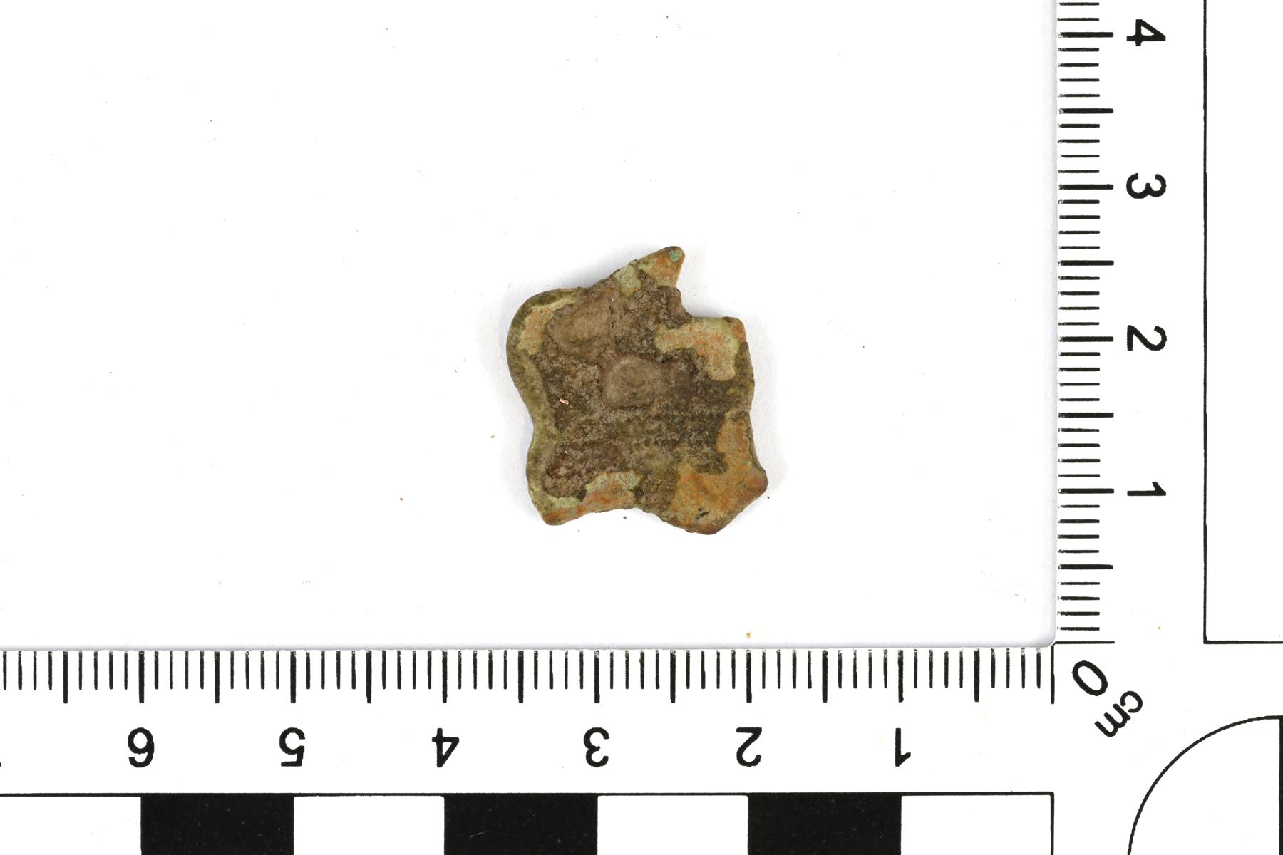 | Mahdollinen riipuksen katkelma. Huonokuntoinen. Koristelusta erottuu kaksi pyöreää kuoppaa. | |