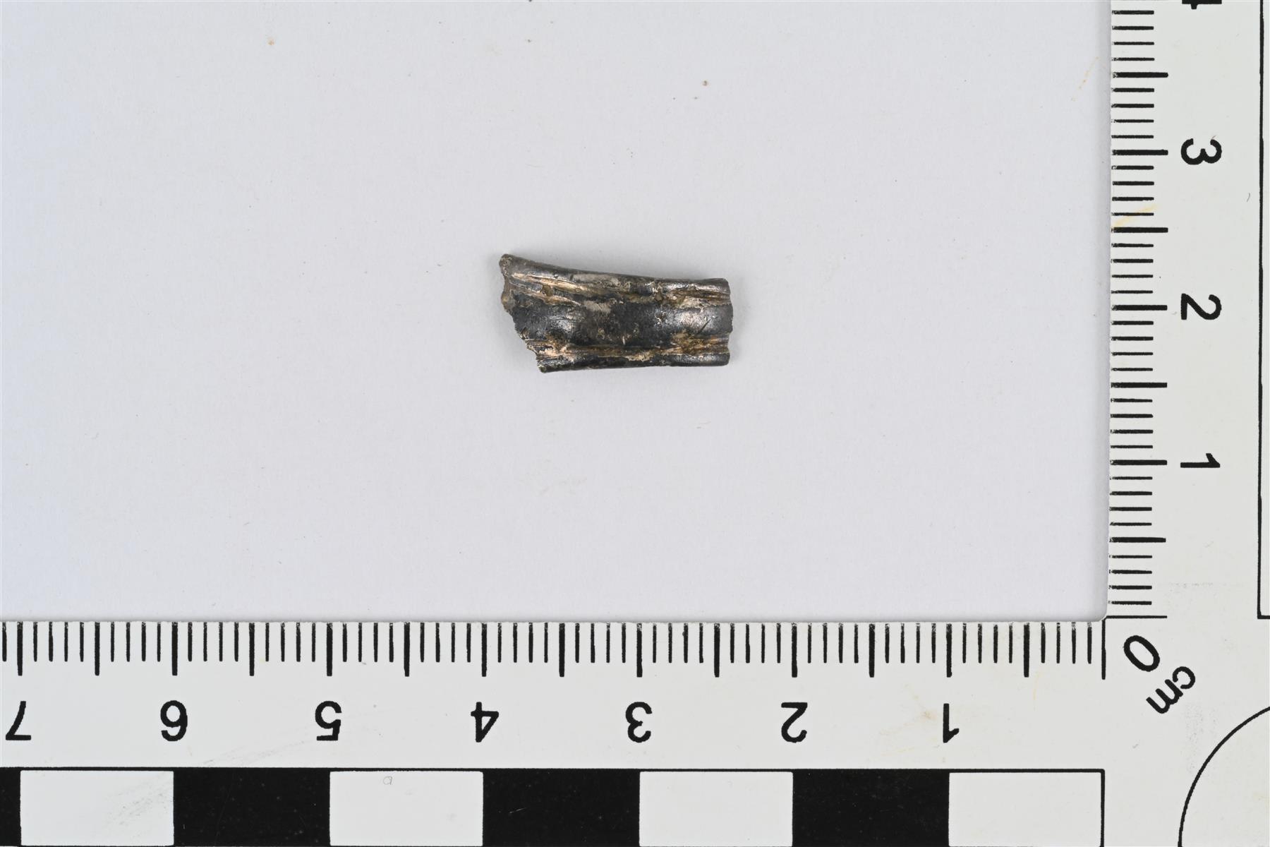 | Sormuksen katkelma. Hopeaa, pinnassa kultauksen jälkiä. Katkelma ilmeisesti samasta sormuksesta, josta aiemmin luetteloitu neljä katkelmaa numerolla KM 42184:1. Kyseessä on ikonografinen sormus, jossa on lähes tunnistamattomaksi tyylittynyt Golgata-aihe. Katkelma on kehän takaosasta, Golgata-aiheen ulkopuolelta. Katkelma levenee hieman toiseen päähän, ja molemmissa reunoissa kulkee reunan suuntainen ura. | |