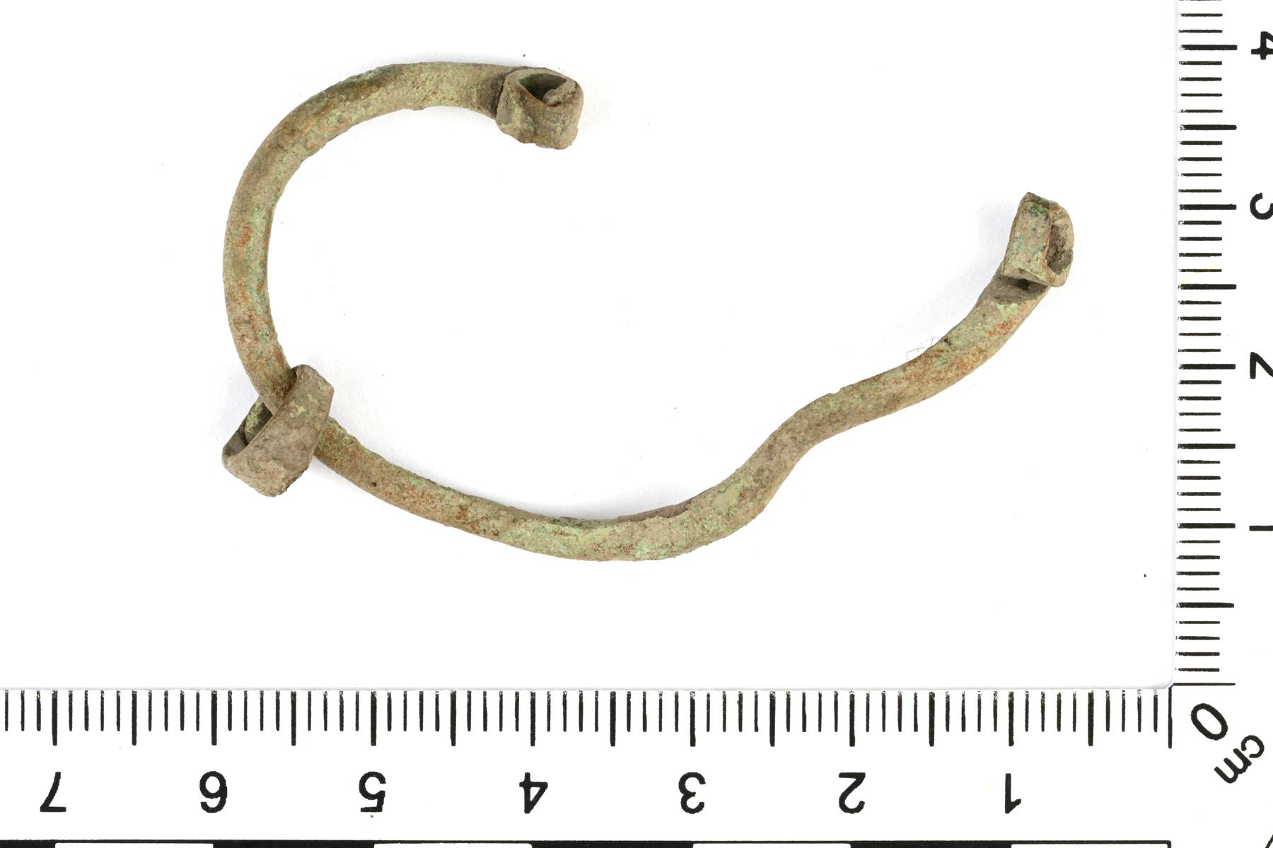 | Vääntynyt rullapäinen hevosenkenkäsolki. Neulasta on jäljellä kehän ympärille kierretty osa. Päät on käännetty rullalle. Kehän poikkileikkaus on pyöreä. | |