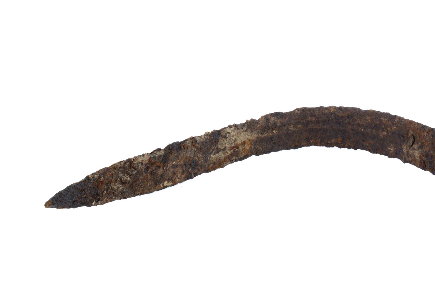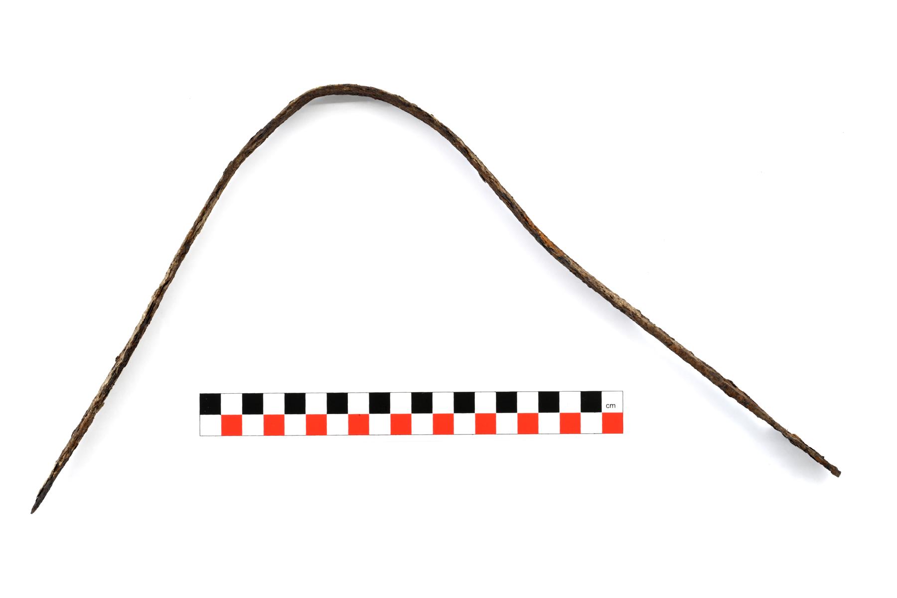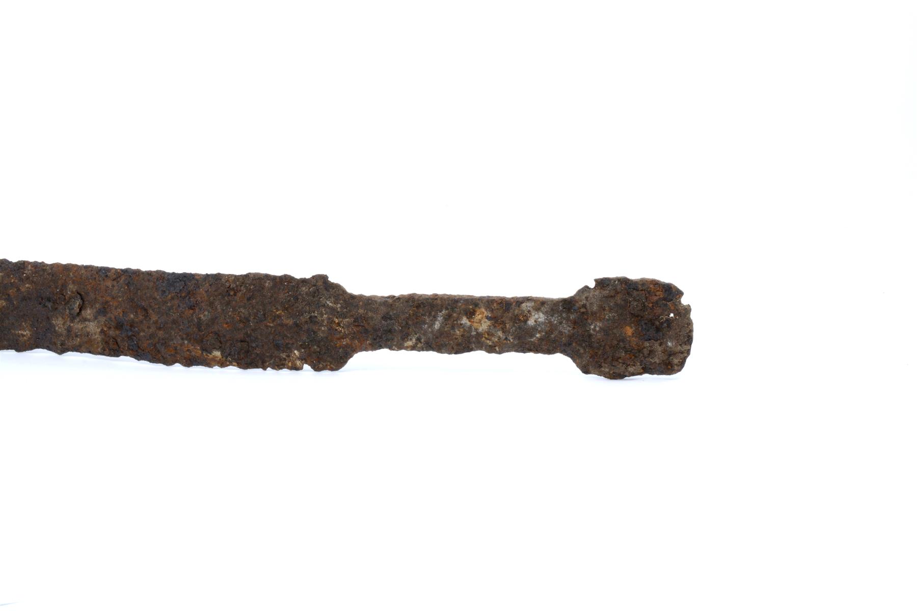 | Kaksiteräinen miekka. Terän kummallakin lappeella on kaksi ohutta veriuraa, jotka alkavat n. 67 mm kahvan yläpäästä ja jatkuvat lähelle kärkeä. Vastaavanlaisia veriuria tavataan spatha-tyypin pitkissä miekoissa. Ruoto on muodoltaan poikkeuksellinen, sillä se on tehty kahvan ja pyöreän ponnen muotoon. Todennäköisimmin alkuperäinen ruoto on hajonnut ja miekka on korjattu muokkaamalla terän alaosasta uusi kahva (ns. täysruoto). Vastaavaa ratkaisua ei tavata yhdessäkään muussa roomalaisajan miekassa Suomesta tai ulkomailta (ks. esim Miks 2007). | |