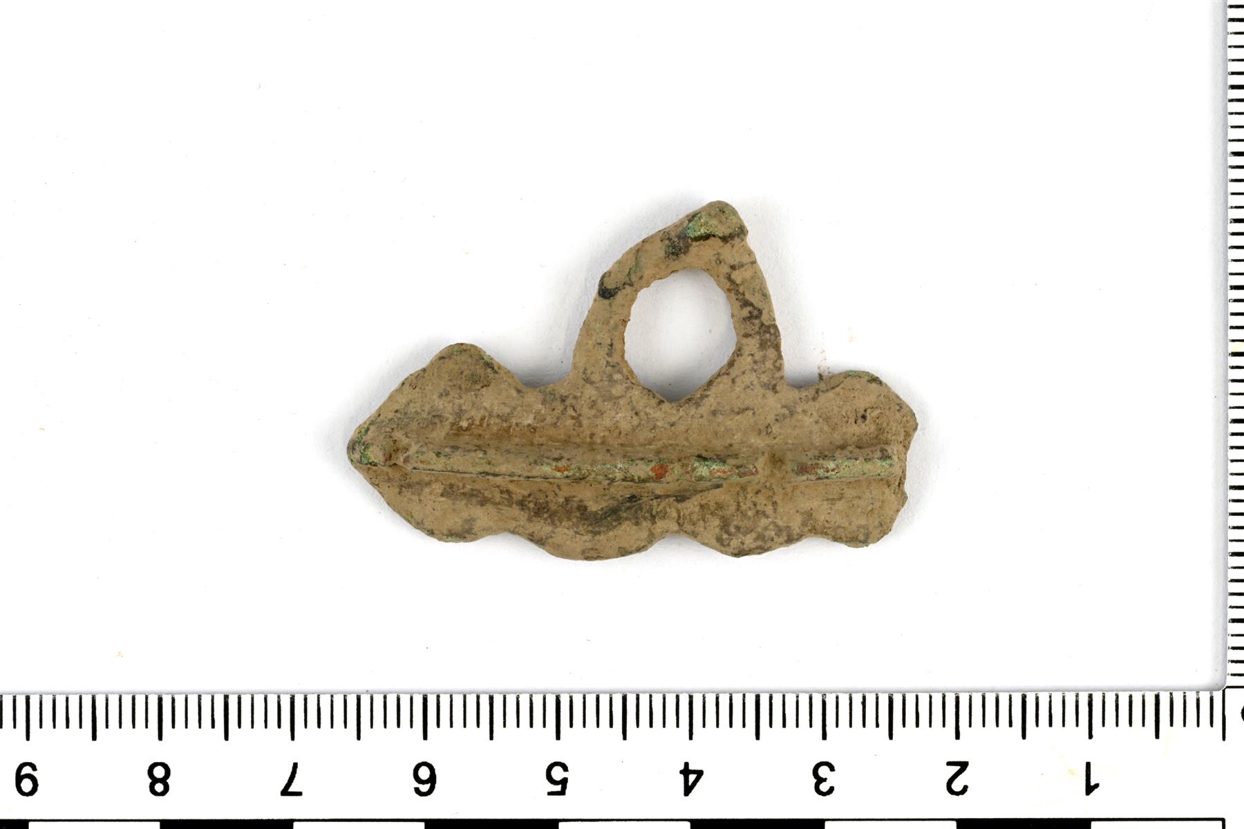 | Lähes kokonaisena säilynyt ketjunjakaja. Toisesta päädystä puuttuu pala ja taustapuolen ketjujen kiinnitysosa on hajonnut. Pinta on hyvin kulunut. Muoto on samantyyppinen kuin Kivikoski Abb. 775. | |