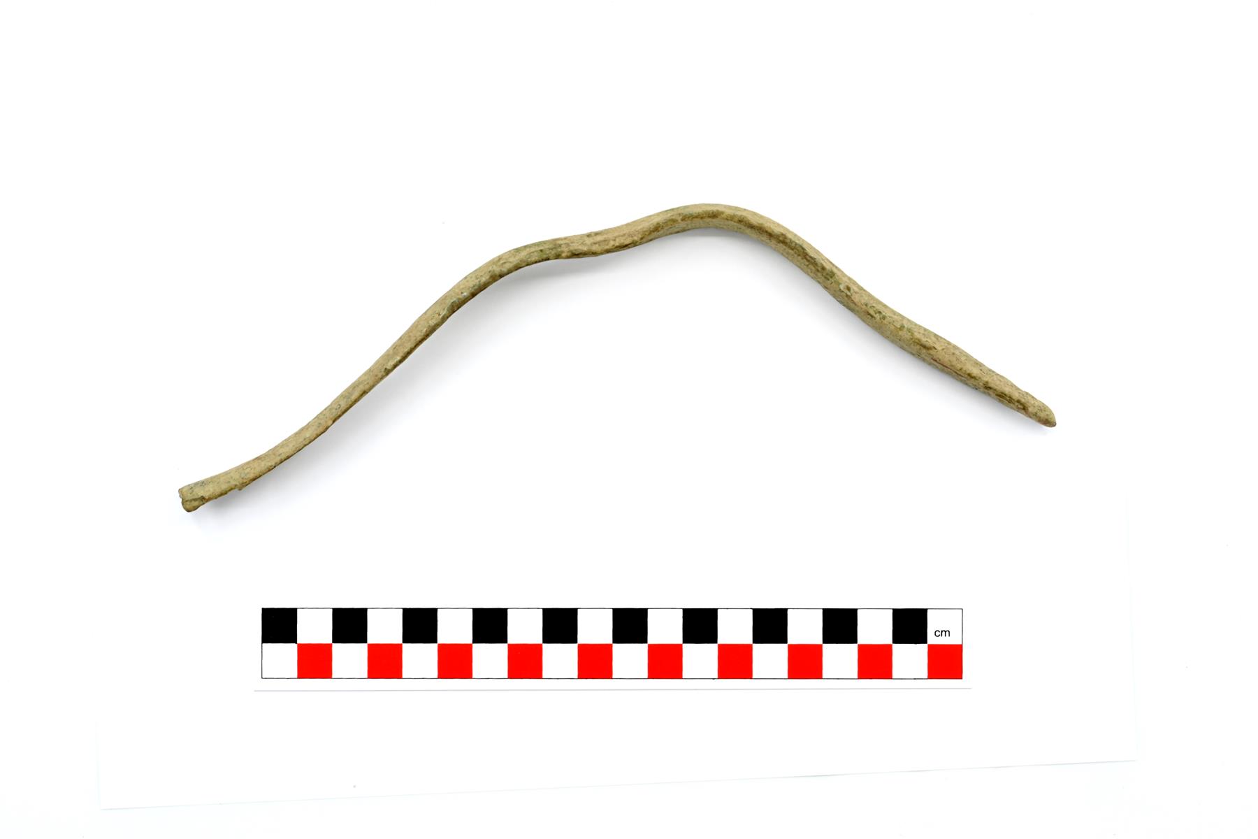 | Päähän kapenevan kupariseosharkon katkelma, joka on taivutettu kahdesta kohdasta. Ehjä pää on pyöristetty. Poikkileikkaus on etupuolelta kupera ja taustapuolelta hieman kovera. | |