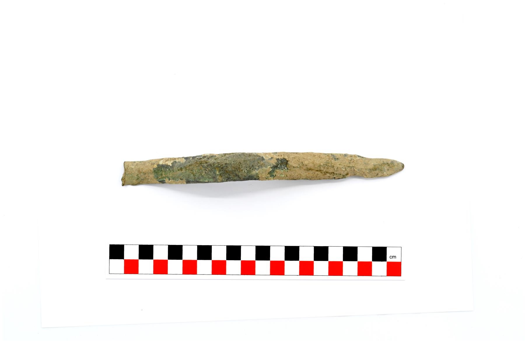 | Päähän kapenevan kupariseosharkon katkelma, joka on taivutettu. Ehjä pää on pyöristetty. Poikkileikkaus on etupuolelta kupera ja taustapuolelta hieman kovera. | |