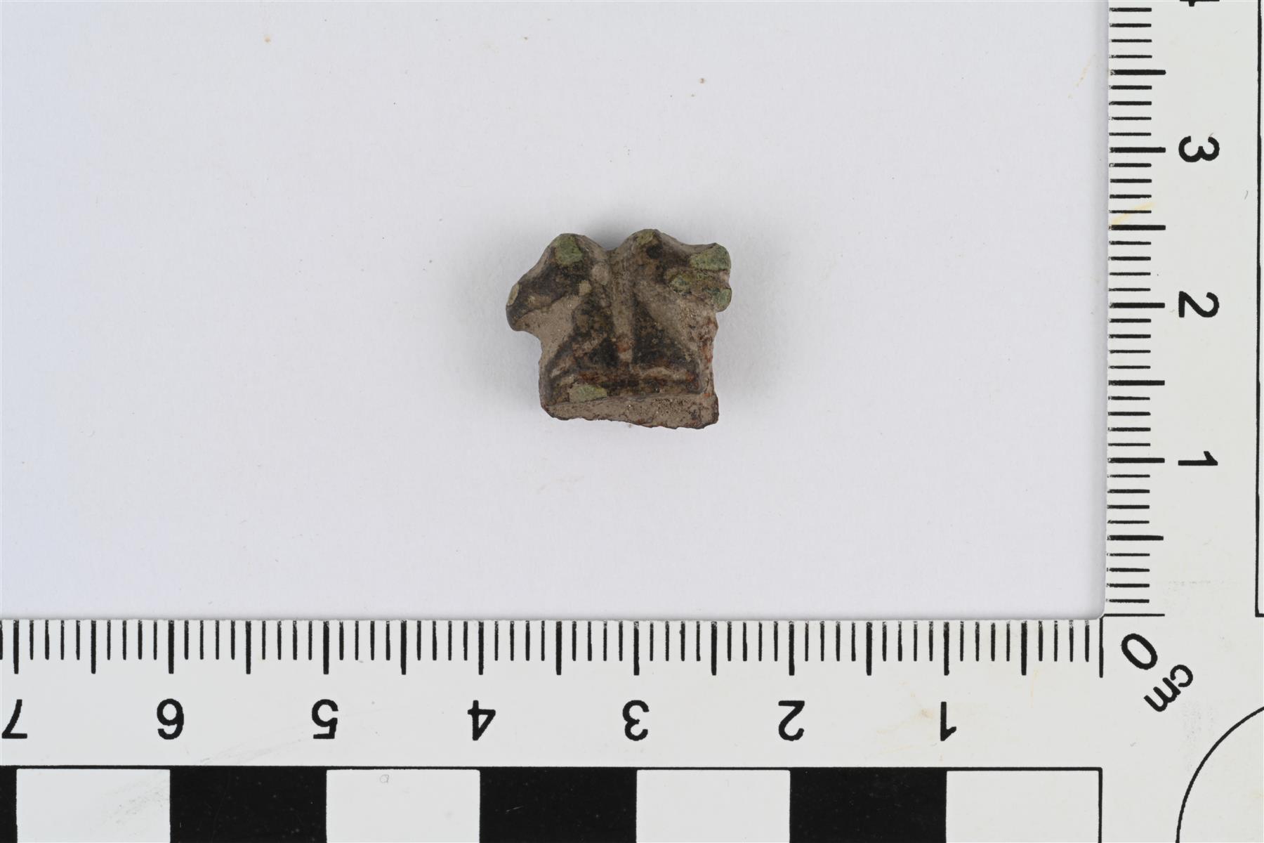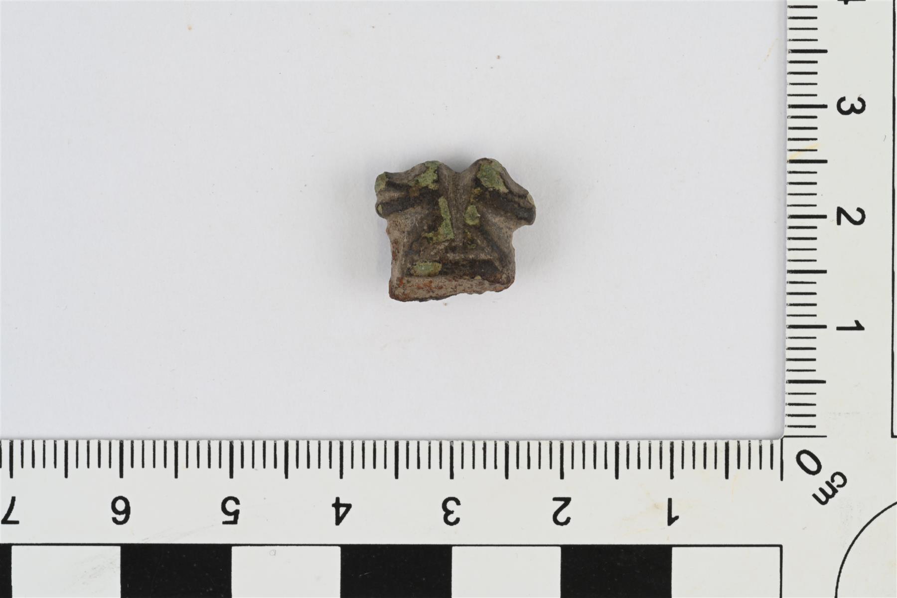 | Pöytäveitsen ylähela. Poikkileikkaus soikea, litistyy hieman yläreunaan. Yläreunassa kaksi sivuille osoittavaa nipukkaa. Alareunassa jäljellä hieman rautaa veitsen ruodosta. | |