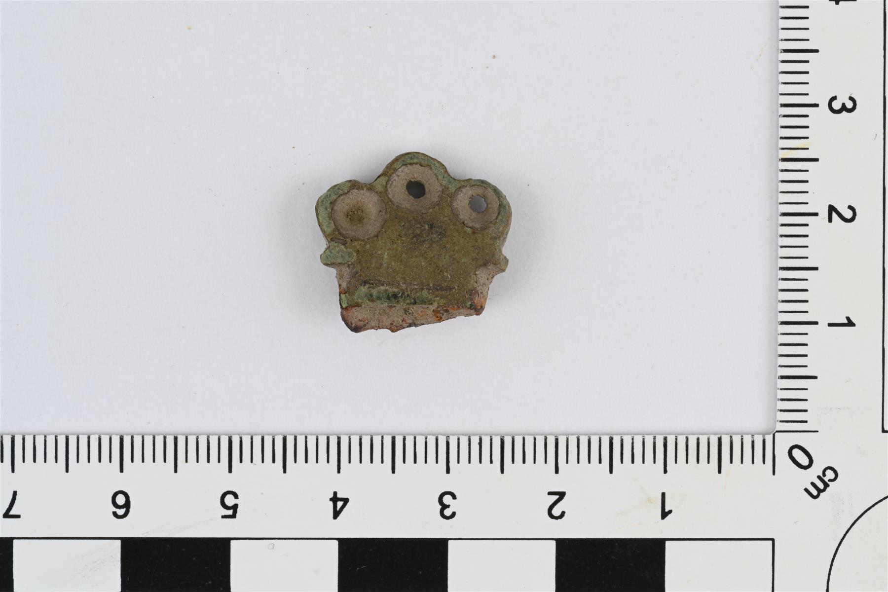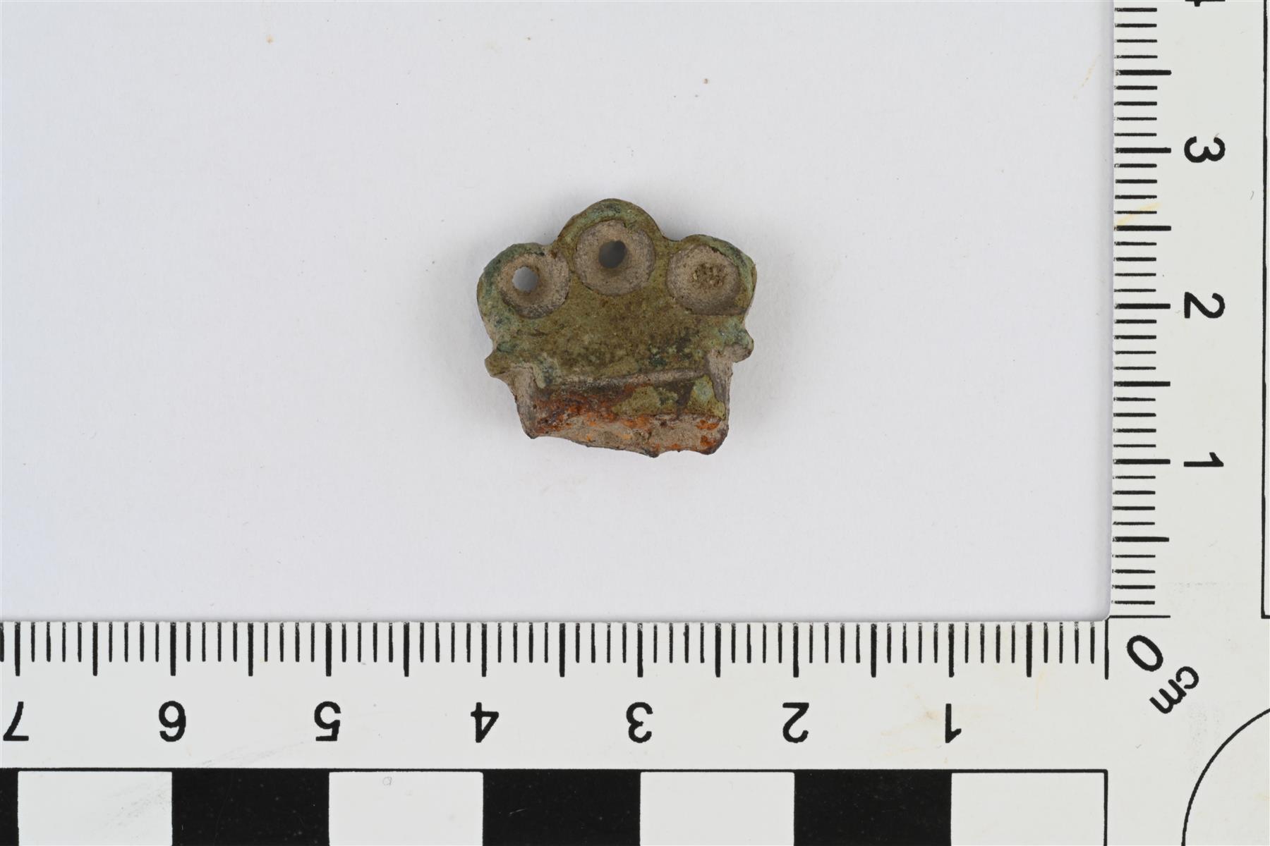 | Pöytäveitsen ylähela. Poikkileikkaus soikea, litistyy hieman yläreunaan. Yläreunassa rivissä kolme pyöreää ulkonemaa, joissa pyöreät reiät. Alareunassa jäljellä hieman rautaa veitsen ruodosta. | |
