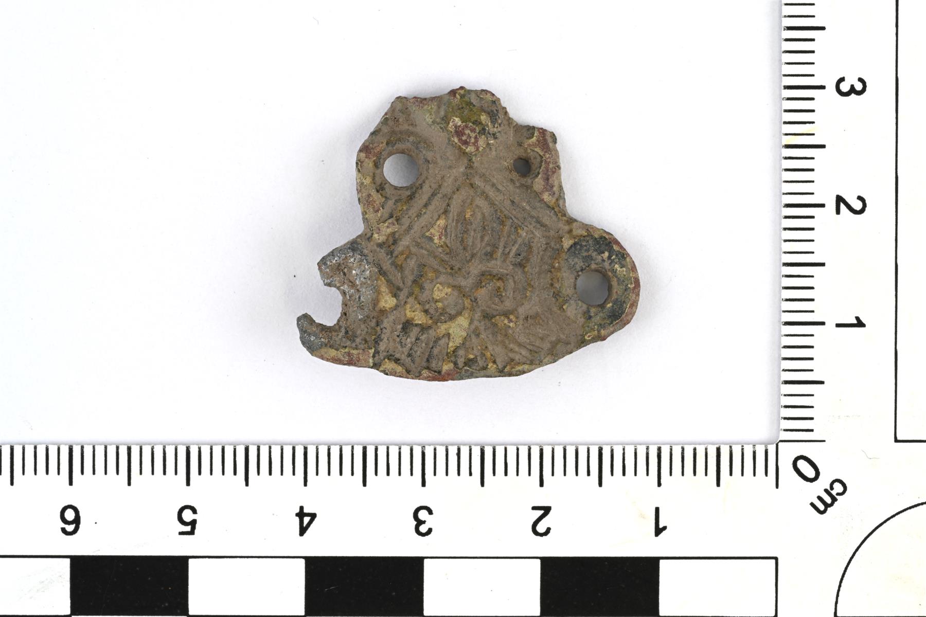 | Tasavartisen soljen päätykatkelma. Koristeltu viivauurteilla ja pyöreillä reikäkuvioilla. Taustapuolella on jousilaitteen kiinnityslenkkien jäänteet. Yksi on kokonaan rikki ja toinen on vääntynyt. Pinnassa on mahdollisesti hopeoinnin jäänteitä. Vastaa tyypin 2 tasavarsisolkia. Vrt. Kivikoski Fig. 2. | |