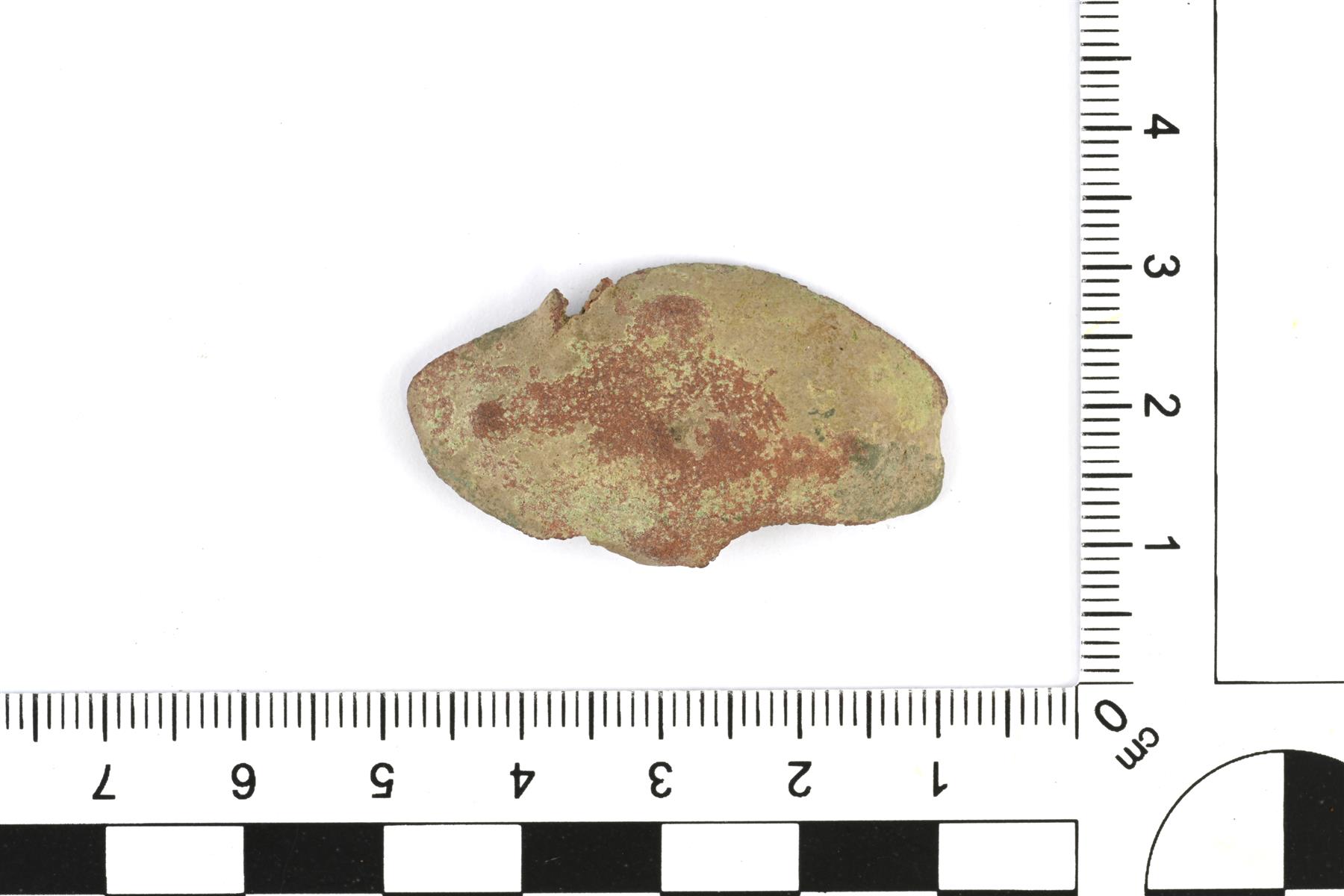 | Tappikoristeisen soljen katkelma. Pinta on hyvin kulunut ja taustapuolen neulakota sekä jousilaitteen kiinnityslenkit ovat hajonneet. | |
