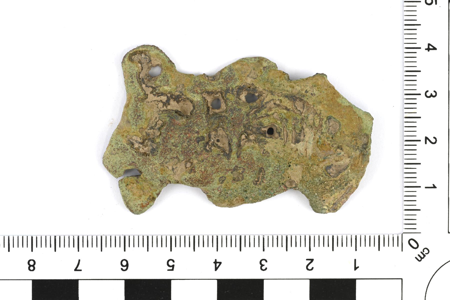 | Lähes muodottomaksi sulaneen pyöreän kupurasoljen katkelma. Koristelusta erottuu viivauurteilla tehtyjä nauhakäärmeitä ja pyöreitä reikiä. | |