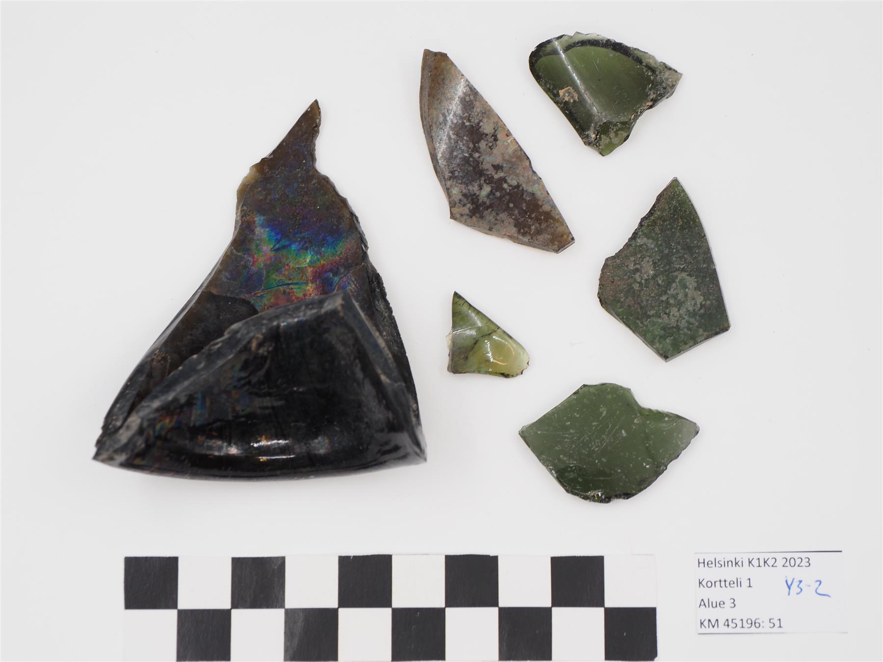 vihreän lasipullon pohjan osa sekä pullon kylkipaloja | |
