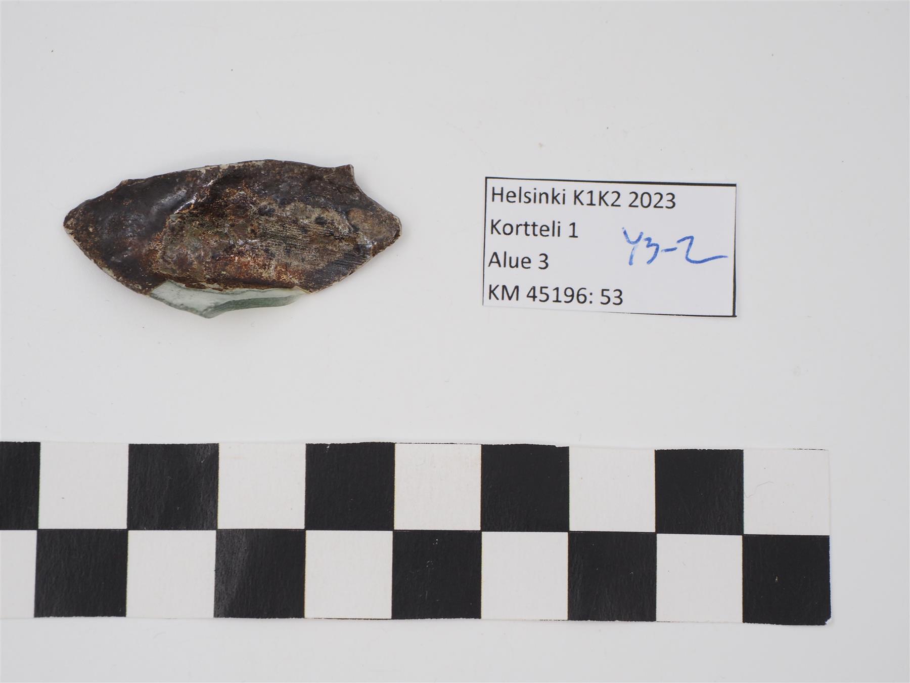 | vihreän lasiastian pala, pinta korrodoitunut | |