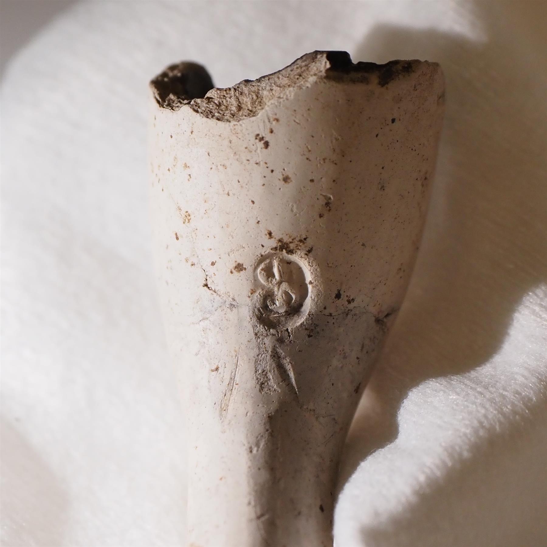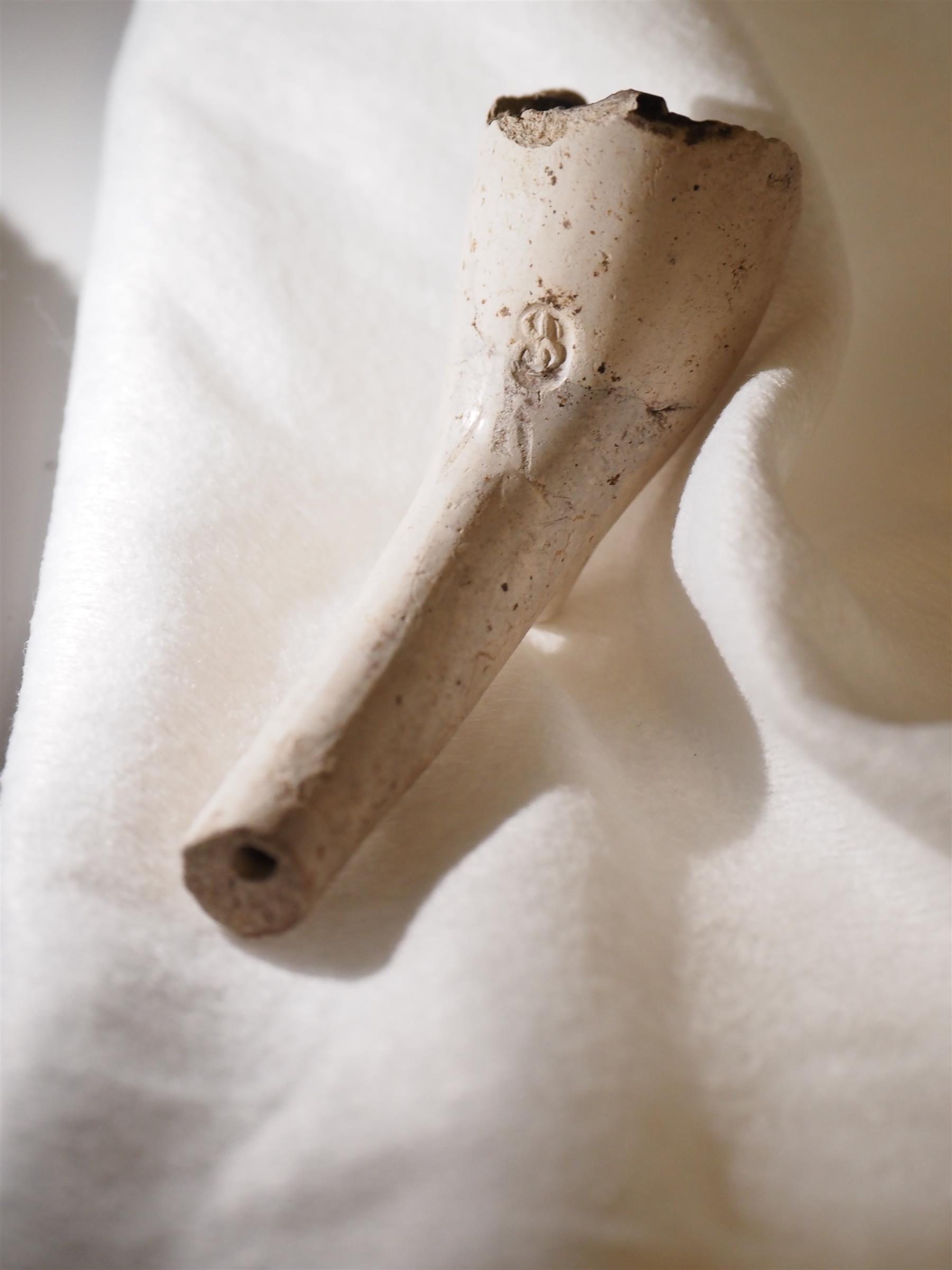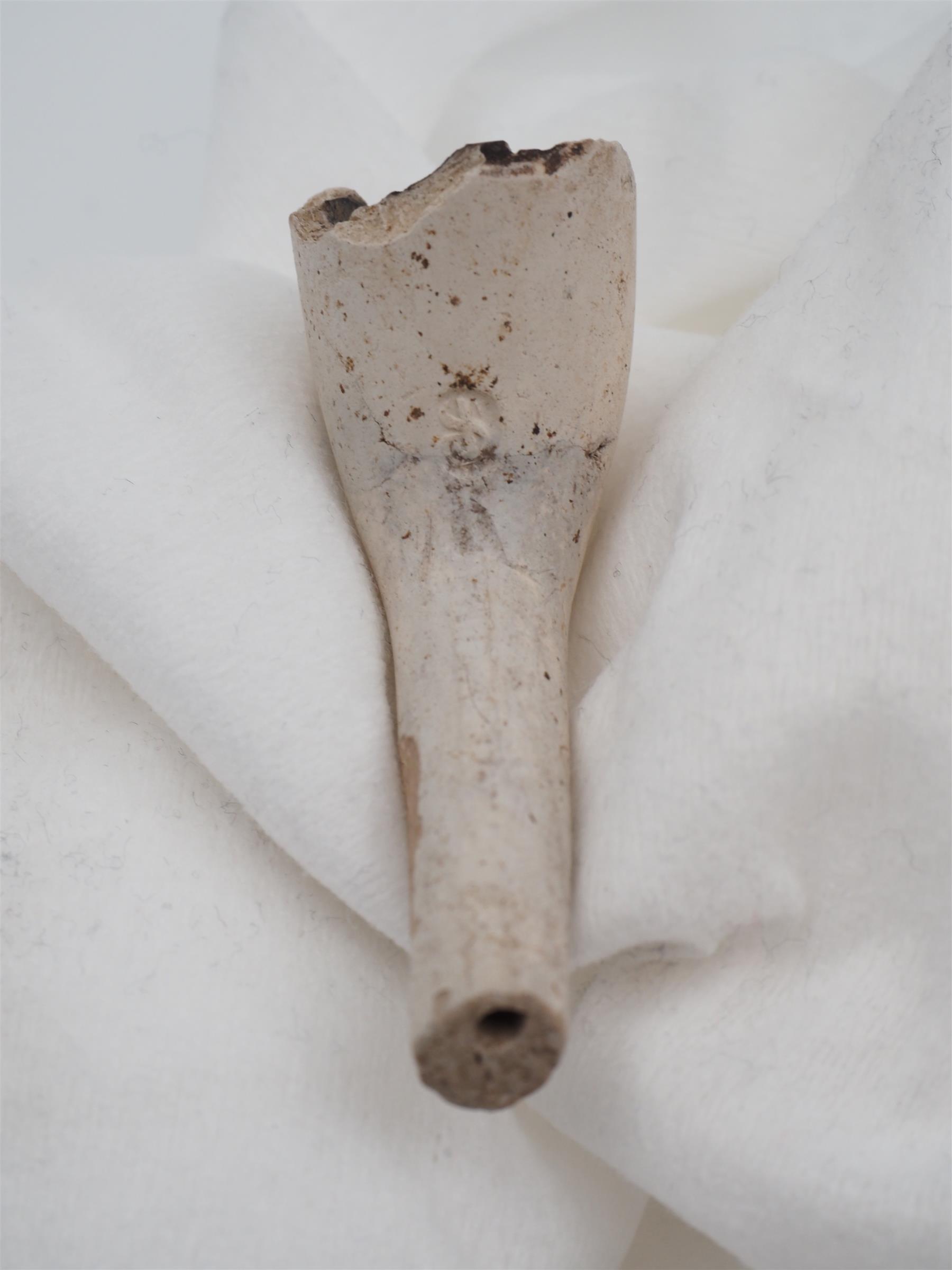| Liitupiipun pesä ja osa vartta, pesän takaosassa pieni väärinpäin leimattu monogrammi "SP" tai "PS" | |