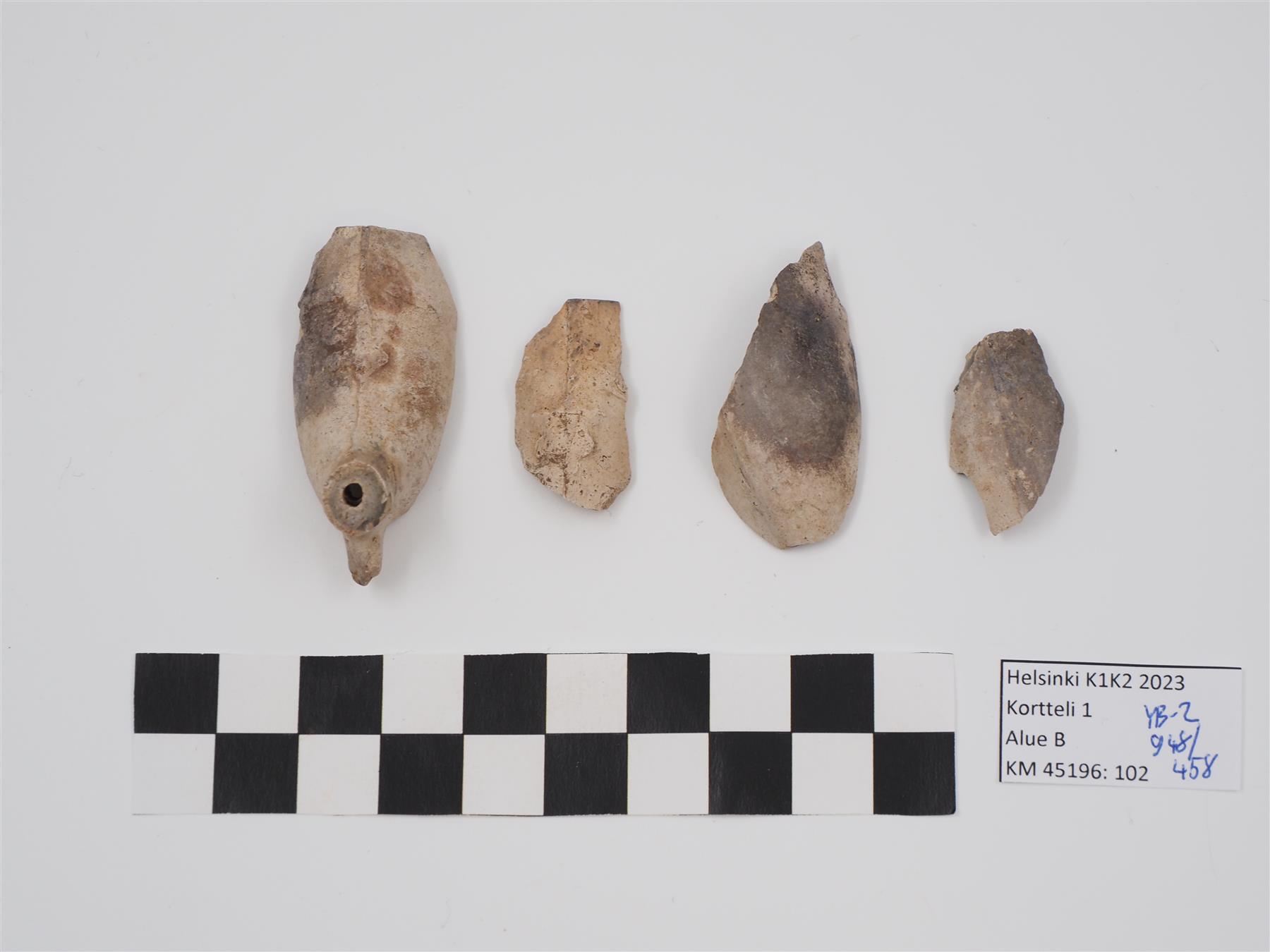 | 4 kappaletta liitupiipun pesän paloja, kahden takaosassa nähtävissä tre kronor -kohokuviointi | |