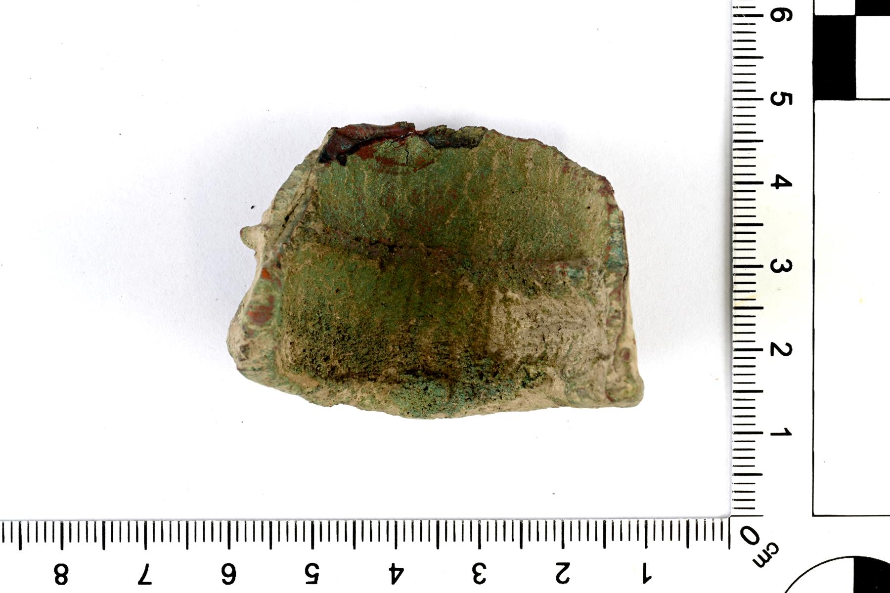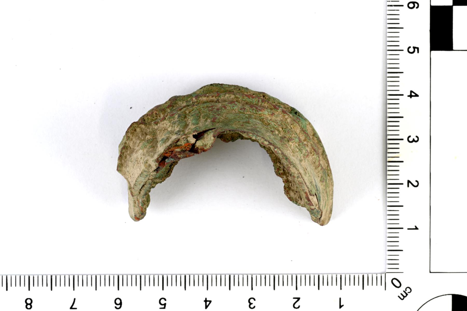 | Kaareva sulaneen kupariseoksen pala. Metalli on todennäköisesti jähmettynyt ahjoon menneen palkeen suuaukon ympärille. | |