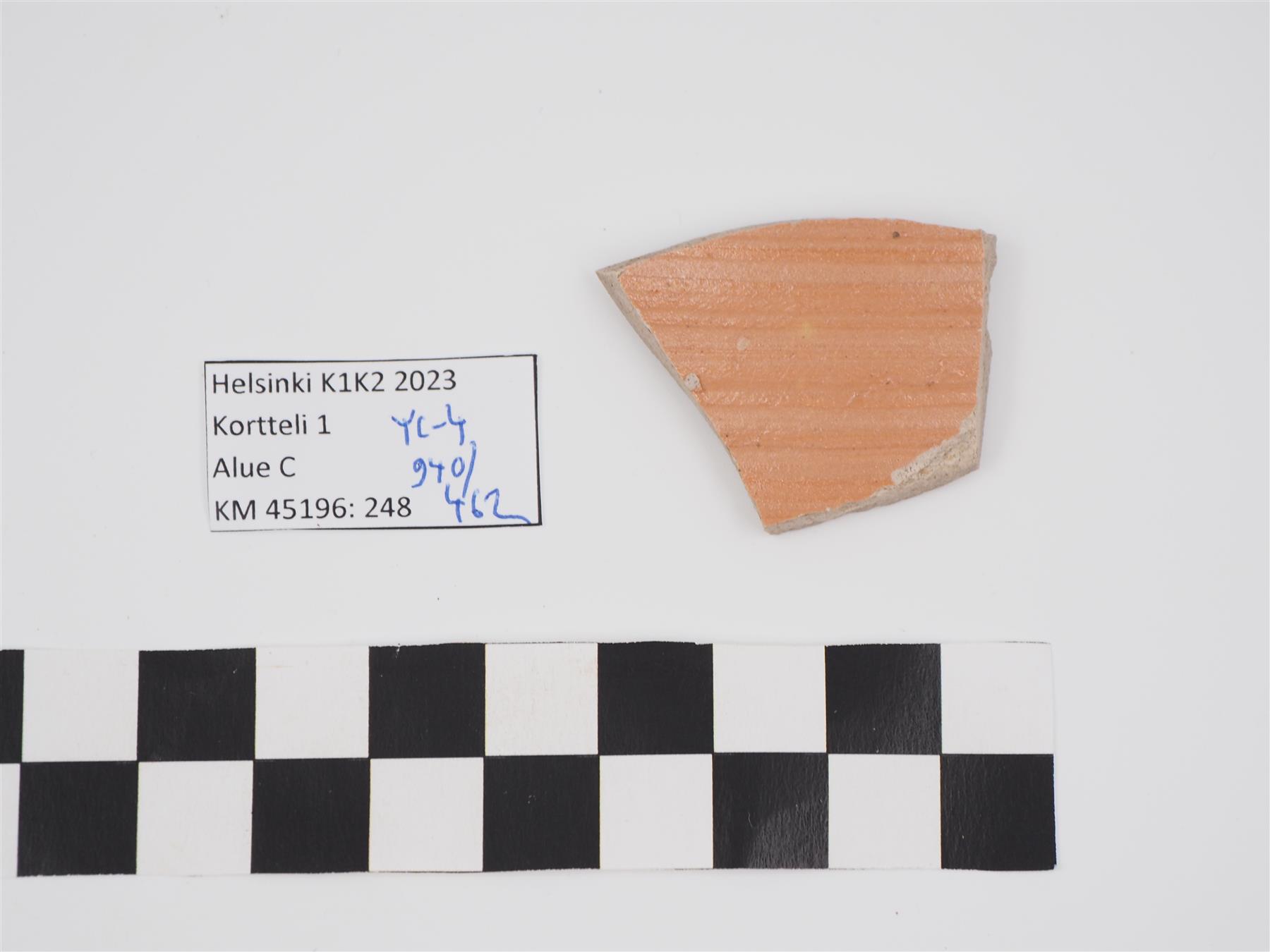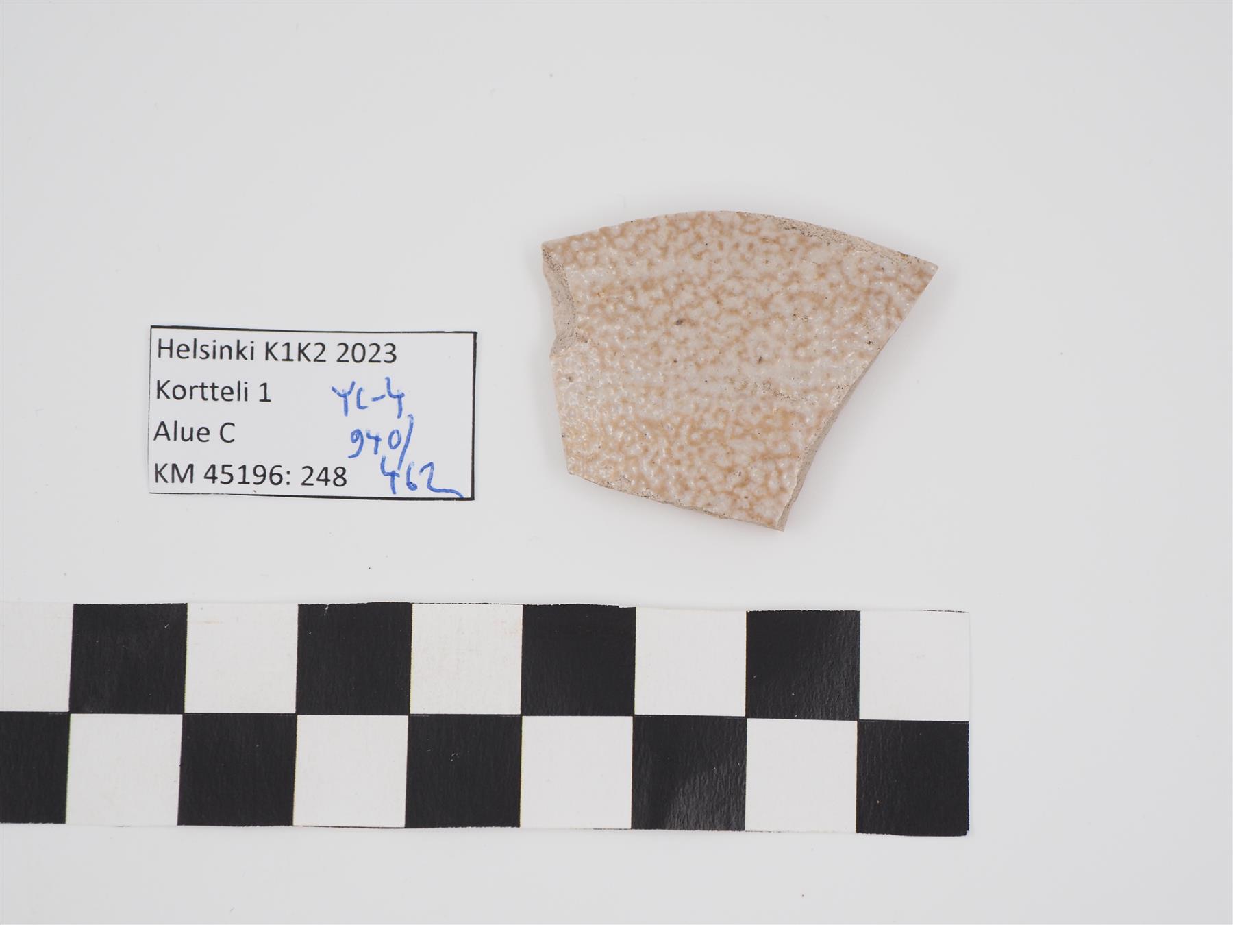 | Kivisavinen seltteripullon kylkipala. Vaalea ulkopinta, sisäpinnalla dreijausjäljet. | |